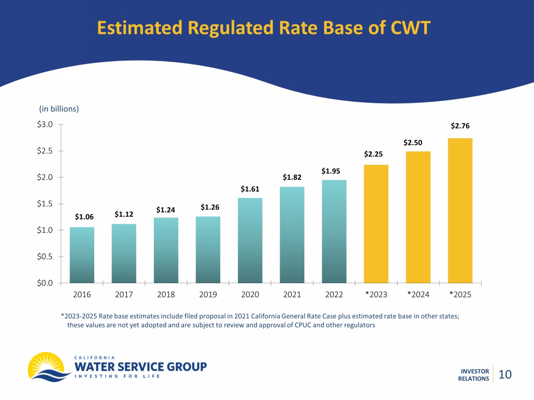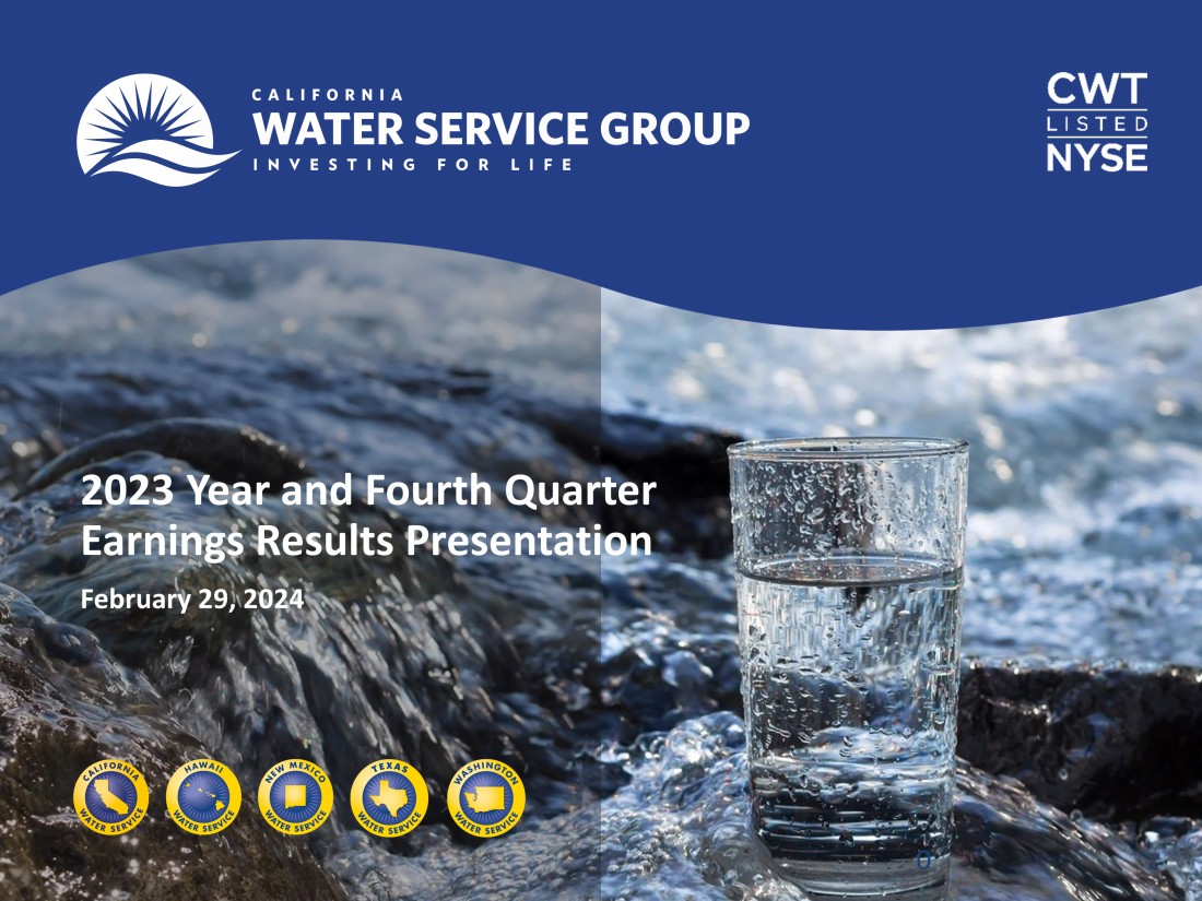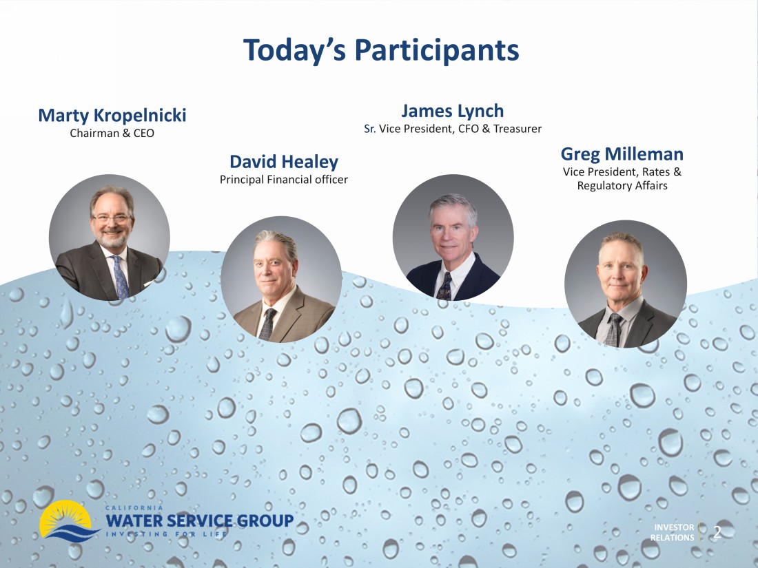 INVESTOR RELATIONS Forward - Looking Statements This presentation contains forward - looking statements within the meaning established by the Private Securities Litigation Reform Act of 1995 ("PSL RA"). The forward - looking statements are intended to qualify under provisions of the federal securities laws for "safe harbor" treatment established by th e PSLRA. Forward - looking statements in this news release are based on currently available information, expectations, estimates, assumptions and projections, and our managemen t’s beliefs, assumptions, judgments and expectations about us, the water utility industry and general economic conditions. These statements are not statements of his tor ical fact. When used in our documents, statements that are not historical in nature, including words like will, would, expects, intends, plans, believes, may, could , e stimates, assumes, anticipates, projects, progress, predicts, hopes, targets, forecasts, should, seeks or variations of these words or similar expressions are intended to identi fy forward - looking statements. Examples of forward - looking statements in this news release include , but are not limited to, statements describing Cal Water’s authorized return on equity, expectations regarding the 2021 GRC Fi lin g and the regulatory process , including timing and business and financial impacts, completion of pending acquisitions, estimated capital investments and de pre ciation and rate base estimates. Forward - looking statements are not guarantees of future performance. They are based on numerous assumptions that we believe are reasonable, but they are open to a wide range of uncertainties and business risks. Consequently, actual results may vary materially from what is conta ine d in a forward - looking statement. Factors that may cause actual results to be different than those expected or anticipated include, but are not limited to: our ability to i nve st or apply the proceeds from the issuance of common stock in an accretive manner; governmental and regulatory commissions' decisions, including decisions on proper disposition o f p roperty; consequences of eminent domain actions relating to our water systems; changes in regulatory commissions' policies and procedures , such as the CPUC’s decision in 2020 to preclude companies from proposing fully decoupled WRAMs, which impacted the 2021 GRC Filing; the outcome and timeliness of regulatory commissions' actions concerning rate relief and other matters, including with respect to the 2021 GRC Filing; increased risk of inverse condemnation losses as a result of climate change and drought; our abi lity to renew leases to operate water systems owned by others on beneficial terms; changes in California State Water Resources Control Board water quality standards; chang es in environmental compliance and water quality requirements; electric power interruptions, especially as a result of Public Safety Power Shutoff (PSPS) programs; housing an d c ustomer growth; the impact of opposition to rate increases; our ability to recover costs; availability of water supplies; issues with the implementation, maintenance or secur ity of our information technology systems; civil disturbances or terrorist threats or acts; the adequacy of our efforts to mitigate physical and cyber security risks and thre ats ; the ability of our enterprise risk management processes to identify or address risks adequately; labor relations matters as we negotiate with the unions; changes in custom er water use patterns and the effects of conservation, including as a result of drought conditions; our ability to complete, in a timely manner or at all, successfull y i ntegrate and achieve anticipated benefits from announced acquisitions; the impact of weather, climate change, natural disasters, and actual or threatened public health emer gen cies, including disease outbreaks, on our operations, water quality, water availability, water sales and operating results and the adequacy of our emergency preparedne ss; restrictive covenants in or changes to the credit ratings on our current or future debt that could increase our financing costs or affect our ability to borrow, make payments on debt or pay dividends; risks associated with expanding our business and operations geographically; the impact of stagnating or worsening business and economic conditions, in cluding inflationary pressures, general economic slowdown or a recession, increasing interest rates, instability of certain financial institutions, changes in moneta ry policy, adverse capital markets activity or macroeconomic conditions as a result of the geopolitical conflicts, and the prospect of a shutdown of the U.S. federal govern men t; the impact of market conditions and volatility on unrealized gains or losses on our non - qualified benefit plan investments and our operating results; the impact of weather and timing of meter reads on our accrued unbilled revenue; the impact of evolving legal and regulatory requirements, including emerging environmental, social and governance re qui rements; and other risks and unforeseen events described in our SEC filings. In light of these risks, uncertainties and assumptions, investors are cautioned not to p lac e undue reliance on forward - looking statements, which speak only as of the date of this news release. When considering forward - looking statements, you should keep in mind the c autionary statements included in this paragraph, as well as the Annual 10 - K, Quarterly 10 - Q, and other reports filed from time - to - time with the Securities and Exchang e Commission (SEC). We are not under any obligation, and we expressly disclaim any obligation to update or alter any forward - looking statements, whether as a result of n ew information, future events or otherwise. 1