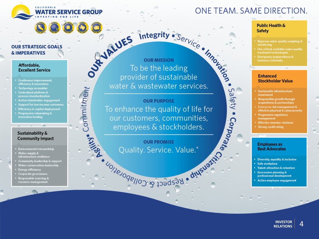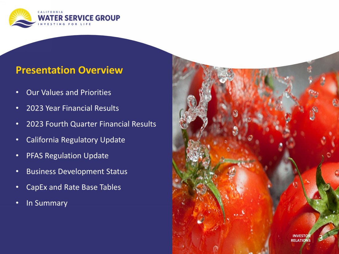 INVESTOR RELATIONS Presentation Overview • Our Values and Priorities • 2023 Year Financial Results • 2023 Fourth Quarter Financial Results • California Regulatory Update • PFAS Regulation Update • Business Development Status • CapEx and Rate Base Tables • In Summary 3
