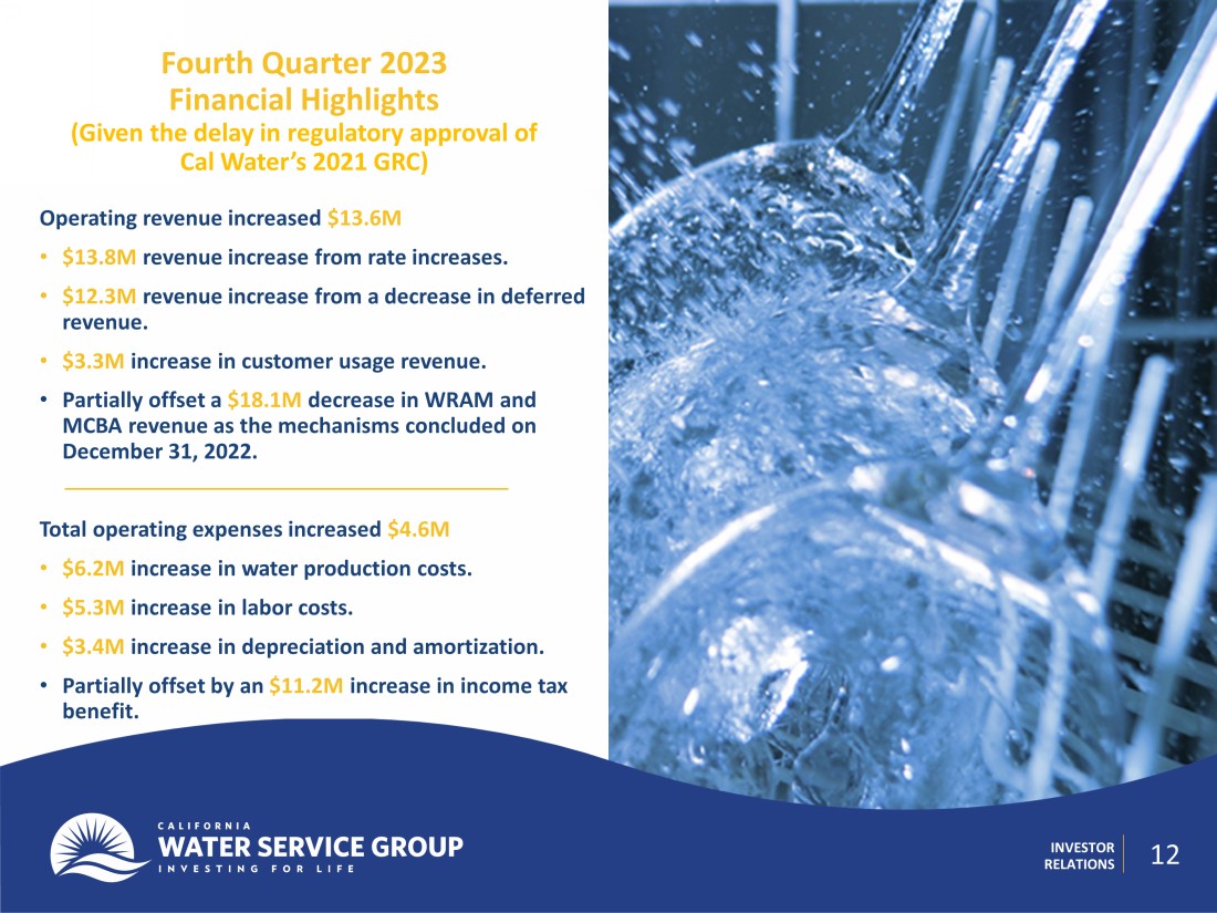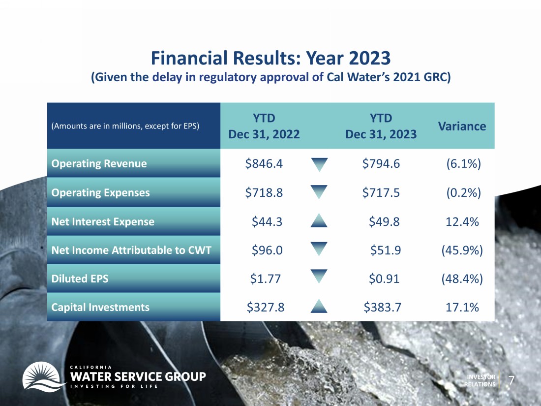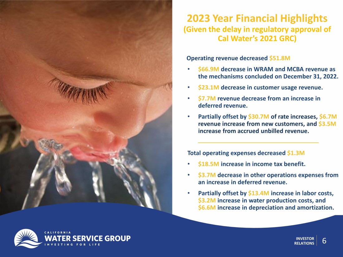 INVESTOR RELATIONS The $44.1 million decrease in net income in 2023 compared to the prior year, was primarily due to the delayed final decision from the California Public Utilities Commission (“CPUC”) on California Water Service Company’s (“Cal Water”) pending 2021 General Rate Case (“2021 GRC”). In January 2024, the assigned CPUC Administrative Law Judges (“ALJs”) issued a Proposed Decision (“PD”) on the fully litigated 2021 GRC, and concurrently, the assigned CPUC Commissioner issued an Alternate Proposed Decision (“APD”) opposing and modifying certain decisions made by the ALJs. The PD issued by the ALJs was closer aligned to Cal Water’s requested revenue requirement where as the APD issued by the assigned CPUC Commissioner was closer aligned to the Public Advocates’ requested revenue requirement. We are unable to determine which of the two proposed decisions will be adopted by the CPUC, or if a second alternate proposed decision will be issued by the CPUC. As a result of uncertainty regarding the decision that will ultimately be made by the CPUC, we are unable to reasonably estimate the impact on 2023 operating revenue and expenses. Full Year 2023 Highlights ( Given the delay in regulatory approval of Cal Water’s 2021 GRC) 5