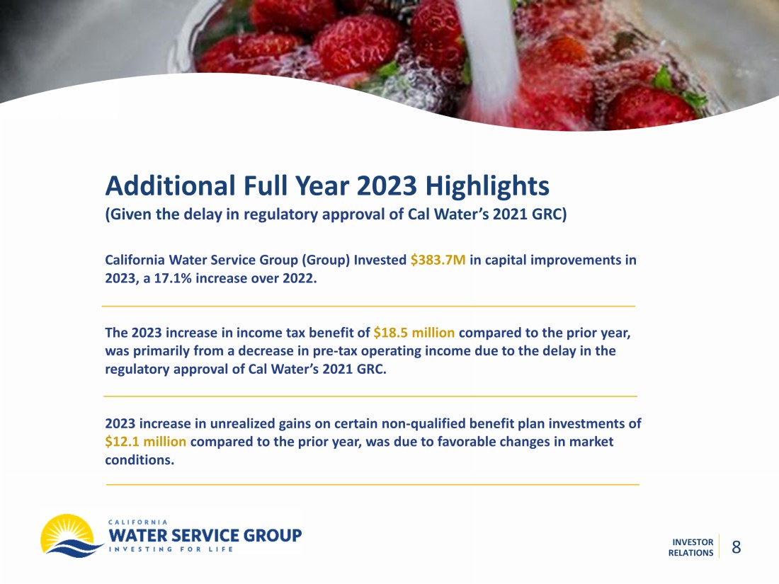 INVESTOR RELATIONS (Amounts are in millions, except for EPS) YTD Dec 31, 2022 YTD Dec 31, 2023 Variance Operating Revenue $846.4 $794.6 (6.1%) Operating Expenses $718.8 $717.5 (0.2%) Net Interest Expense $44.3 $49.8 12.4% Net In come Attributable to CWT $96.0 $51.9 (45.9%) Diluted EPS $1.77 $0.91 (48.4%) Capital Investments $327.8 $383.7 17.1% Financial Results: Year 2023 ( Given the delay in regulatory approval of Cal Water’s 2021 GRC) 7