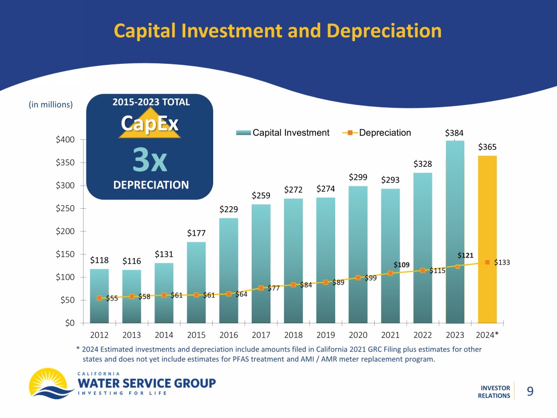 INVESTOR RELATIONS $118 $116 $131 $177 $229 $259 $272 $274 $299 $293 $328 $384 $365 $55 $58 $61 $61 $64 $77 $84 $89 $99 $115 $133 $0 $50 $100 $150 $200 $250 $300 $350 $400 2012 2013 2014 2015 2016 2017 2018 2019 2020 2021 2022 2023 2024* Capital Investment Depreciation Capital Investment and Depreciation (in millions) * 2024 Estimated investments and depreciation include amounts filed in California 2021 GRC Filing plus estimates for other states and does not yet include estimates for PFAS treatment and AMI / AMR meter replacement program. 2015 - 2023 TOTAL CapEx 3x DEPRECIATION $109 9 $121 9