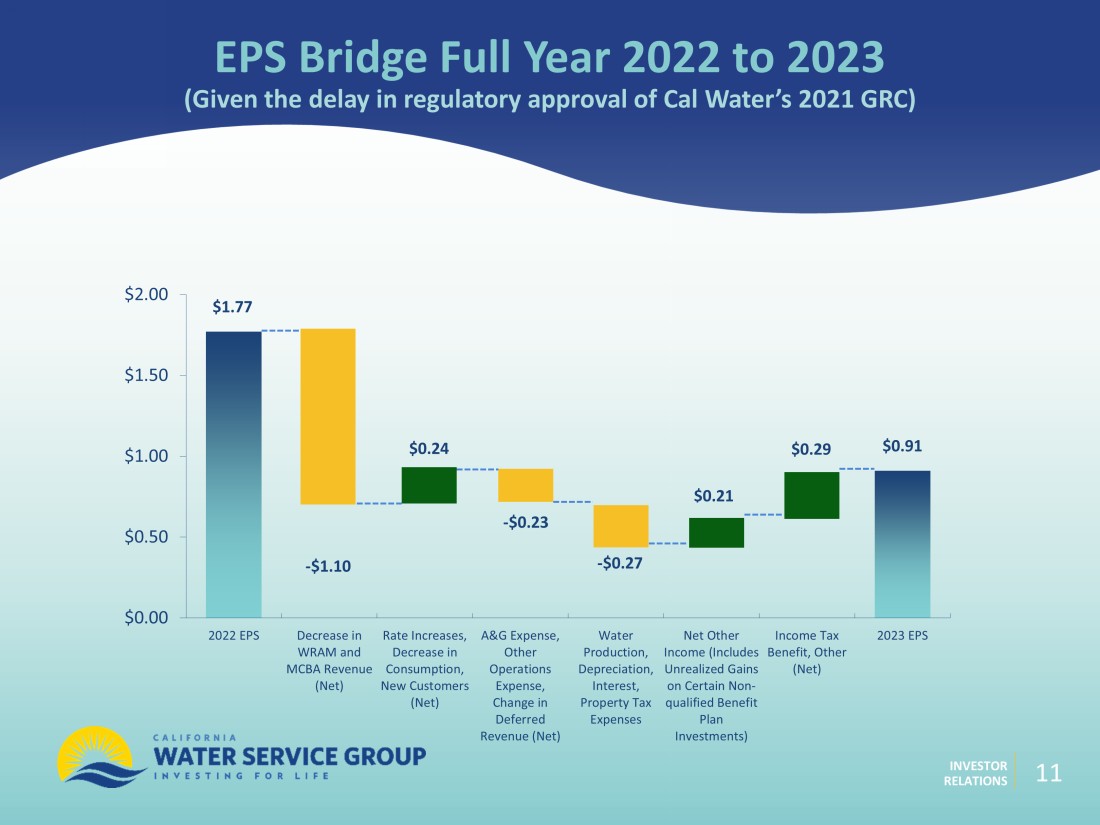 INVESTOR RELATIONS Estimated Regulated Rate Base of CWT (in billions) *2023 - 2025 Rate base estimates include filed proposal in 2021 California General Rate Case plus estimated rate base in other sta tes; these values are not yet adopted and are subject to review and approval of CPUC and other regulators $1.06 $1.12 $1.24 $1.61 $2.76 $1.26 $1.82 $0.0 $0.5 $1.0 $1.5 $2.0 $2.5 $3.0 2016 2017 2018 2019 2020 2021 2022 *2023 *2024 *2025 $1.95 $2.25 $2.50 10 10
