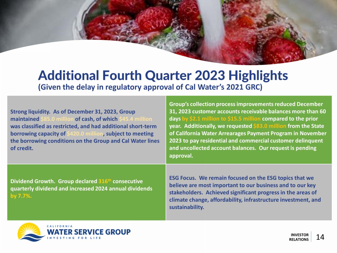 INVESTOR RELATIONS (Amounts are in millions, except for EPS) Fourth Quarter 2022 Fourth Quarter 2023 Variance Operating Revenue $200.9 $214.5 6.8% Operating Expenses $174.7 $179.3 2.6% Net Interest Expense $11.1 $12.3 11.2% Net In come Attributable to CWT $19.6 $30.1 53.8% Diluted EPS $0.35 $0.52 47.0% Capital Investments $105.7 $109.6 3.7% Financial Results: Fourth Quarter 2023 ( Given the delay in regulatory approval of Cal Water’s 2021 GRC) 13