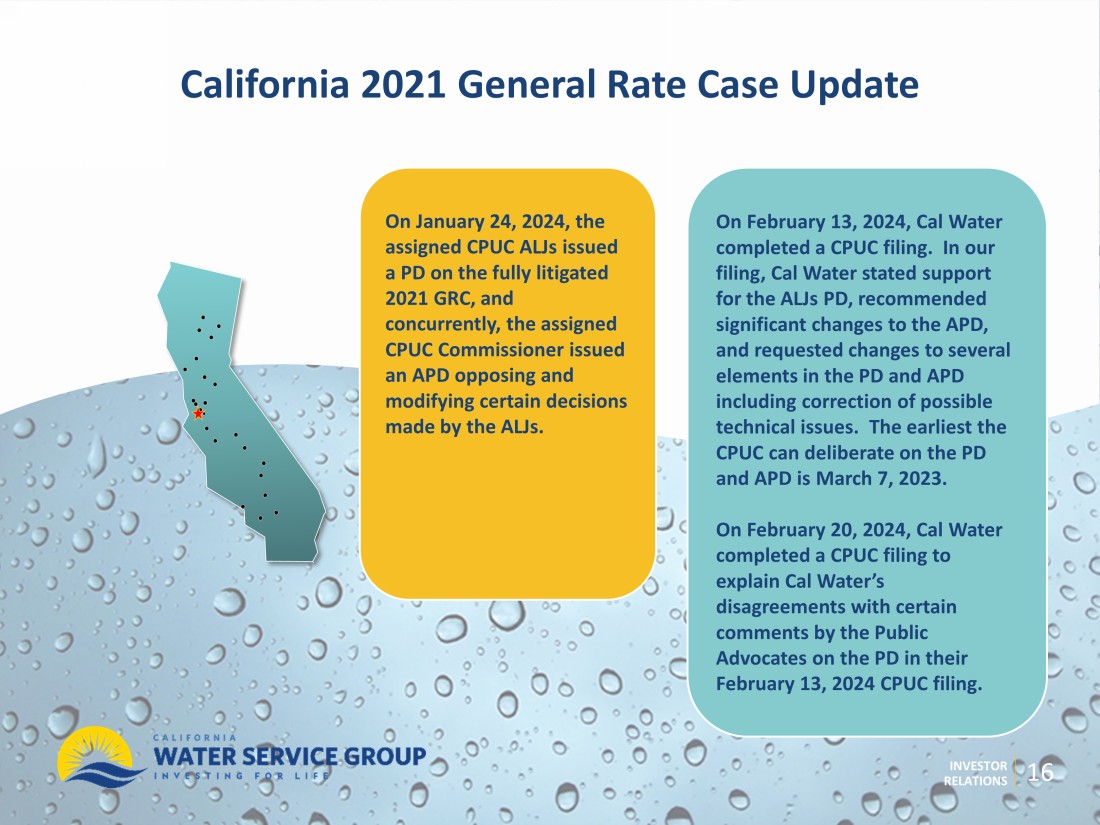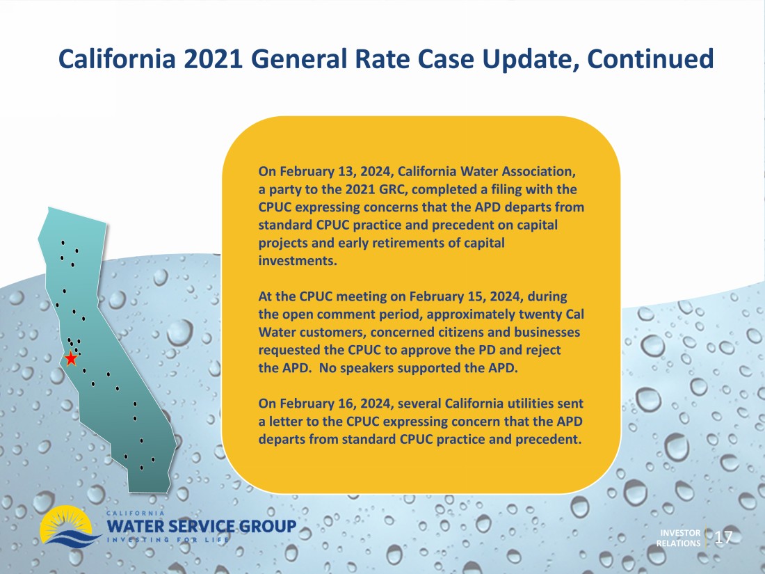 INVESTOR RELATIONS California 2021 General Rate Case Update On January 24, 2024, the assigned CPUC ALJs issued a PD on the fully litigated 2021 GRC, and concurrently, the assigned CPUC Commissioner issued an APD opposing and modifying certain decisions made by the ALJs. On February 13, 2024, Cal Water completed a CPUC filing. In our filing, Cal Water stated support for the ALJs PD, recommended significant changes to the APD, and requested changes to several elements in the PD and APD including correction of possible technical issues. The earliest the CPUC can deliberate on the PD and APD is March 7, 2023. On February 20, 2024, Cal Water completed a CPUC filing to explain Cal Water’s disagreements with certain comments by the Public Advocates on the PD in their February 13, 2024 CPUC filing. 16