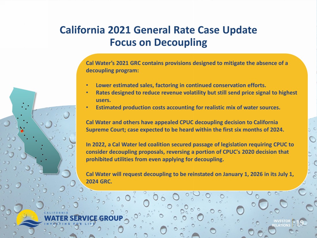 INVESTOR RELATIONS California 2021 General Rate Case Update, Continued 18 We are unable to determine which of the proposed decisions will be adopted by the CPUC, or if a second alternate proposed decision will be issued by the CPUC. O nce approved by the CPUC, the Cal Water 2021 GRC cumulative adjustment plus interest, which is retroactive to January 1, 2023 , will be recorded.