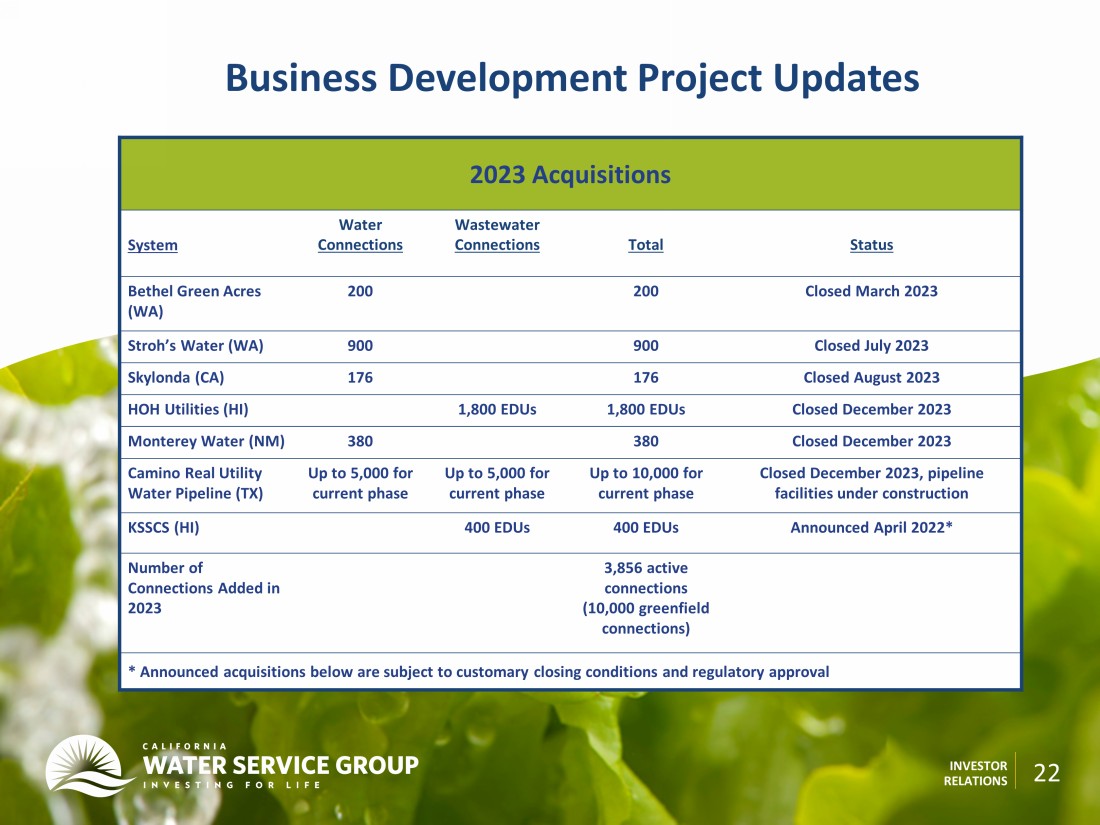 INVESTOR RELATIONS Business Development Project Updates 2023 Acquisitions System Water Connections Wastewater Connections Total Status Bethel Green Acres (WA) 200 200 Closed March 2023 Stroh’s Water (WA) 900 900 Closed July 2023 Skylonda (CA) 176 176 Closed August 2023 HOH Utilities (HI) 1,800 EDUs 1,800 EDUs Closed December 2023 Monterey Water (NM) 380 380 Closed December 2023 Camino Real Utility Water Pipeline (TX) Up to 5,000 for current phase Up to 5,000 for current phase Up to 10,000 for current phase Closed December 2023, pipeline facilities under construction KSSCS (HI) 400 EDUs 400 EDUs Announced April 2022* Number of Connections Added in 2023 3,856 active connections (10,000 greenfield connections) * Announced acquisitions below are subject to customary closing conditions and regulatory approval 22