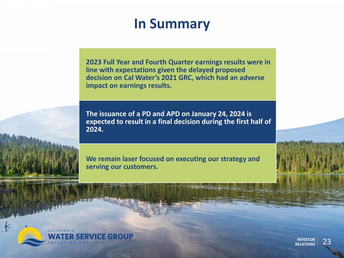 INVESTOR RELATIONS In Summary 23 2023 Full Year and Fourth Quarter earnings results were in line with expectations given the delayed proposed decision on Cal Water’s 2021 GRC, which had an adverse impact on earnings results. The issuance of a PD and APD on January 24, 2024 is expected to result in a final decision during the first half of 2024. We remain laser focused on executing our strategy and serving our customers.