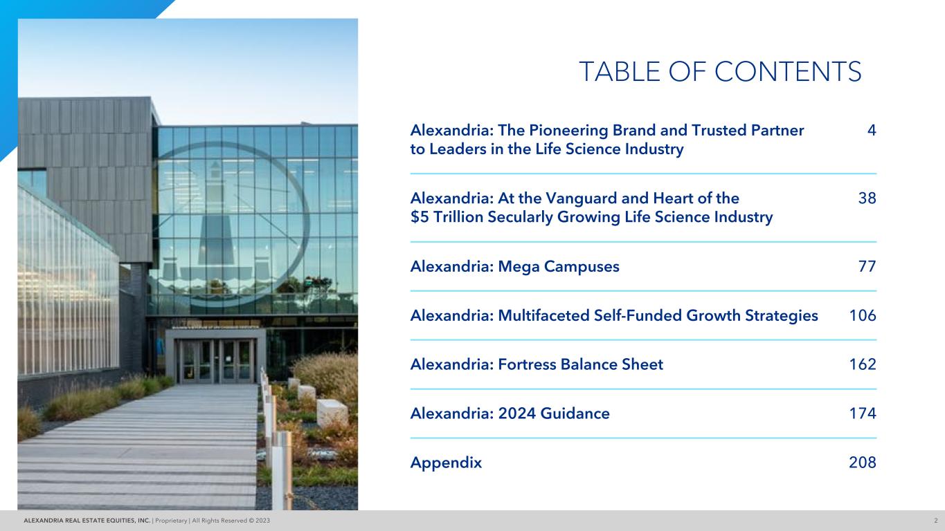 2ALEXANDRIA REAL ESTATE EQUITIES, INC. | Proprietary | All Rights Reserved © 2023 TABLE OF CONTENTS Alexandria: The Pioneering Brand and Trusted Partner to Leaders in the Life Science Industry 4 Alexandria: At the Vanguard and Heart of the $5 Trillion Secularly Growing Life Science Industry 38 Alexandria: Mega Campuses 77 Alexandria: Multifaceted Self-Funded Growth Strategies 106 Alexandria: Fortress Balance Sheet 162 Alexandria: 2024 Guidance 174 Appendix 208