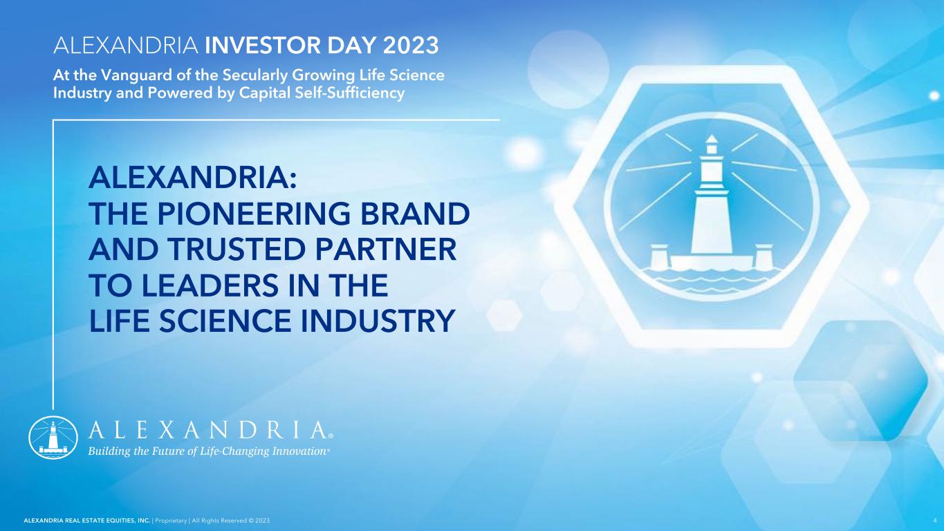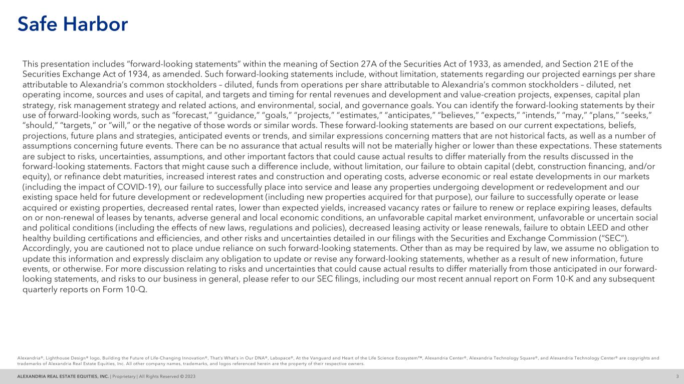3ALEXANDRIA REAL ESTATE EQUITIES, INC. | Proprietary | All Rights Reserved © 2023 Safe Harbor This presentation includes “forward-looking statements” within the meaning of Section 27A of the Securities Act of 1933, as amended, and Section 21E of the Securities Exchange Act of 1934, as amended. Such forward-looking statements include, without limitation, statements regarding our projected earnings per share attributable to Alexandria’s common stockholders – diluted, funds from operations per share attributable to Alexandria’s common stockholders – diluted, net operating income, sources and uses of capital, and targets and timing for rental revenues and development and value-creation projects, expenses, capital plan strategy, risk management strategy and related actions, and environmental, social, and governance goals. You can identify the forward-looking statements by their use of forward-looking words, such as “forecast,” “guidance,” “goals,” “projects,” “estimates,” “anticipates,” “believes,” “expects,” “intends,” “may,” “plans,” “seeks,” “should,” “targets,” or “will,” or the negative of those words or similar words. These forward-looking statements are based on our current expectations, beliefs, projections, future plans and strategies, anticipated events or trends, and similar expressions concerning matters that are not historical facts, as well as a number of assumptions concerning future events. There can be no assurance that actual results will not be materially higher or lower than these expectations. These statements are subject to risks, uncertainties, assumptions, and other important factors that could cause actual results to differ materially from the results discussed in the forward-looking statements. Factors that might cause such a difference include, without limitation, our failure to obtain capital (debt, construction financing, and/or equity), or refinance debt maturities, increased interest rates and construction and operating costs, adverse economic or real estate developments in our markets (including the impact of COVID-19), our failure to successfully place into service and lease any properties undergoing development or redevelopment and our existing space held for future development or redevelopment (including new properties acquired for that purpose), our failure to successfully operate or lease acquired or existing properties, decreased rental rates, lower than expected yields, increased vacancy rates or failure to renew or replace expiring leases, defaults on or non-renewal of leases by tenants, adverse general and local economic conditions, an unfavorable capital market environment, unfavorable or uncertain social and political conditions (including the effects of new laws, regulations and policies), decreased leasing activity or lease renewals, failure to obtain LEED and other healthy building certifications and efficiencies, and other risks and uncertainties detailed in our filings with the Securities and Exchange Commission (“SEC”). Accordingly, you are cautioned not to place undue reliance on such forward-looking statements. Other than as may be required by law, we assume no obligation to update this information and expressly disclaim any obligation to update or revise any forward-looking statements, whether as a result of new information, future events, or otherwise. For more discussion relating to risks and uncertainties that could cause actual results to differ materially from those anticipated in our forward- looking statements, and risks to our business in general, please refer to our SEC filings, including our most recent annual report on Form 10-K and any subsequent quarterly reports on Form 10-Q. Alexandria®, Lighthouse Design® logo, Building the Future of Life-Changing Innovation®, That’s What’s in Our DNA®, Labspace®, At the Vanguard and Heart of the Life Science Ecosystem™, Alexandria Center®, Alexandria Technology Square®, and Alexandria Technology Center® are copyrights and trademarks of Alexandria Real Estate Equities, Inc. All other company names, trademarks, and logos referenced herein are the property of their respective owners.