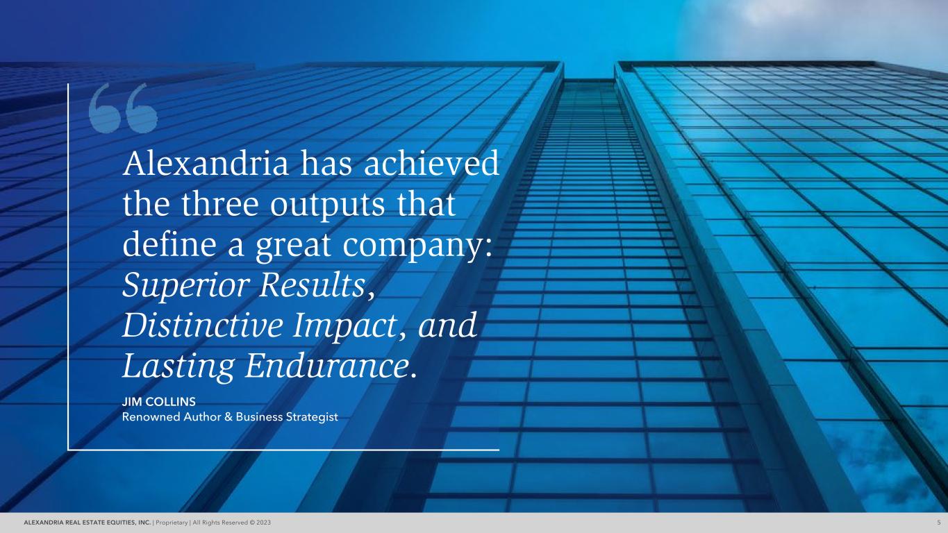 4ALEXANDRIA REAL ESTATE EQUITIES, INC. | Proprietary | All Rights Reserved © 2023 ALEXANDRIA INVESTOR DAY 2023 At the Vanguard of the Secularly Growing Life Science Industry and Powered by Capital Self-Sufficiency ALEXANDRIA: THE PIONEERING BRAND AND TRUSTED PARTNER TO LEADERS IN THE LIFE SCIENCE INDUSTRY