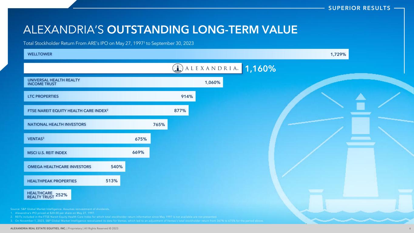 5ALEXANDRIA REAL ESTATE EQUITIES, INC. | Proprietary | All Rights Reserved © 2023 Alexandria has achieved the three outputs that define a great company: Superior Results, Distinctive Impact, and Lasting Endurance. JIM COLLINS Renowned Author & Business Strategist