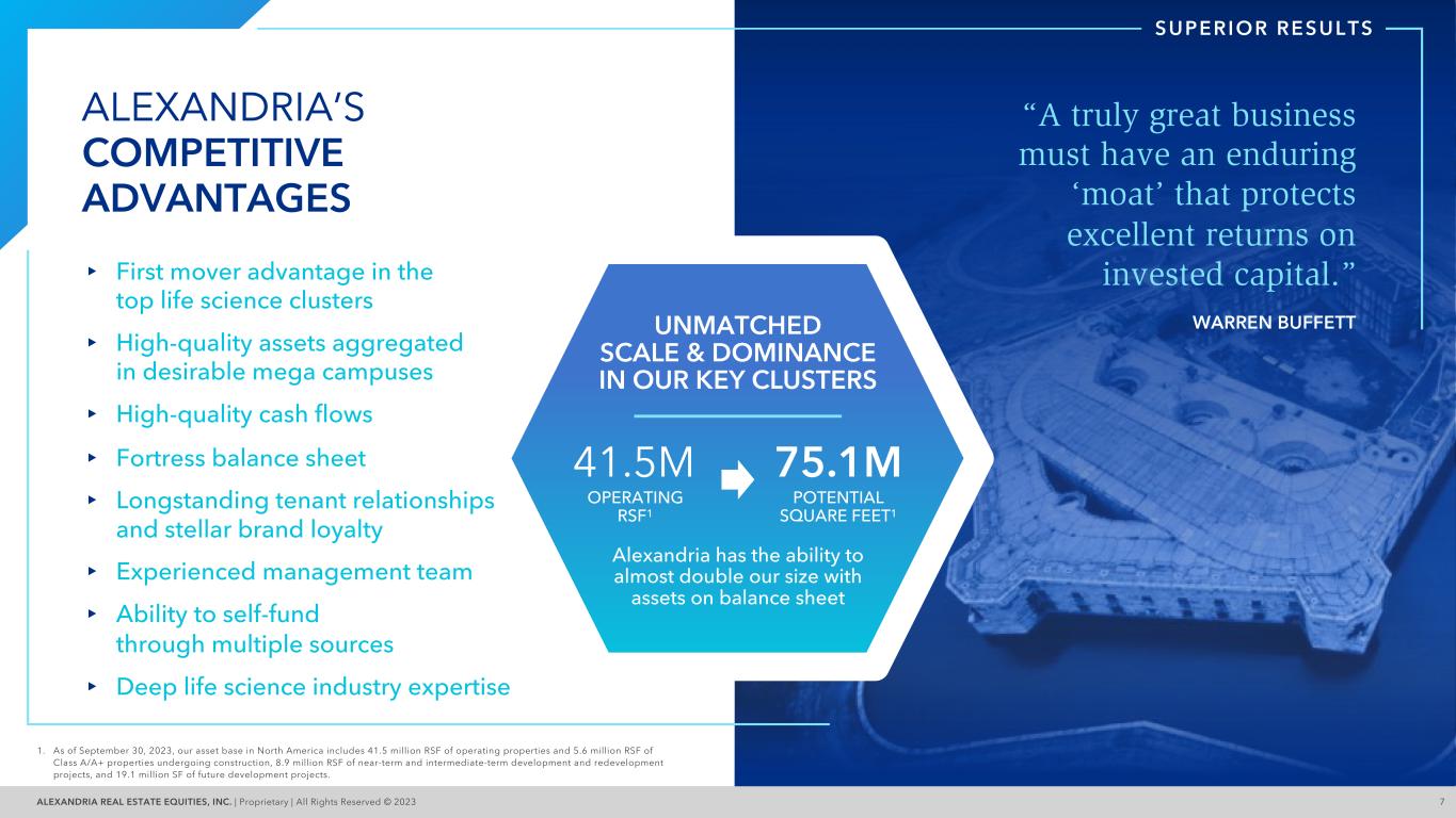 6ALEXANDRIA REAL ESTATE EQUITIES, INC. | Proprietary | All Rights Reserved © 2023 252% 513% 540% 669% 675% 765% 877% 914% 1,060% 1,160% 1,729% HEALTHCARE REALTY TRUST Total Stockholder Return From ARE’s IPO on May 27, 19971 to September 30, 2023 WELLTOWER UNIVERSAL HEALTH REALTY INCOME TRUST LTC PROPERTIES NATIONAL HEALTH INVESTORS OMEGA HEALTHCARE INVESTORS MSCI U.S. REIT INDEX HEALTHPEAK PROPERTIES FTSE NAREIT EQUITY HEALTH CARE INDEX2 ALEXANDRIA’S OUTSTANDING LONG-TERM VALUE Source: S&P Global Market Intelligence. Assumes reinvestment of dividends. 1. Alexandria’s IPO priced at $20.00 per share on May 27, 1997. 2. REITs included in the FTSE Nareit Equity Health Care Index for which total stockholder return information since May 1997 is not available are not presented. 3. On November 1, 2023, S&P Global Market Intelligence reevaluated its data for Ventas, which led to an adjustment of Ventas’s total stockholder return from 367% to 675% for the period above. SUPERIOR RESULTS VENTAS3