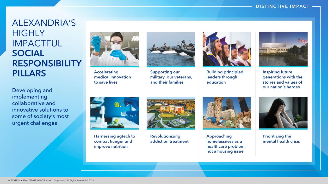 8ALEXANDRIA REAL ESTATE EQUITIES, INC. | Proprietary | All Rights Reserved © 2023 OUR MISSION DISTINCTIVE IMPACT To create and grow life science ecosystems and clusters that ignite and accelerate the world’s leading innovators in their noble pursuit to advance human health by curing disease and improving nutrition