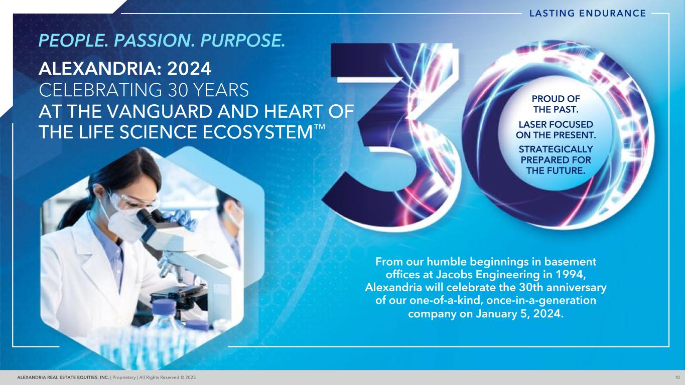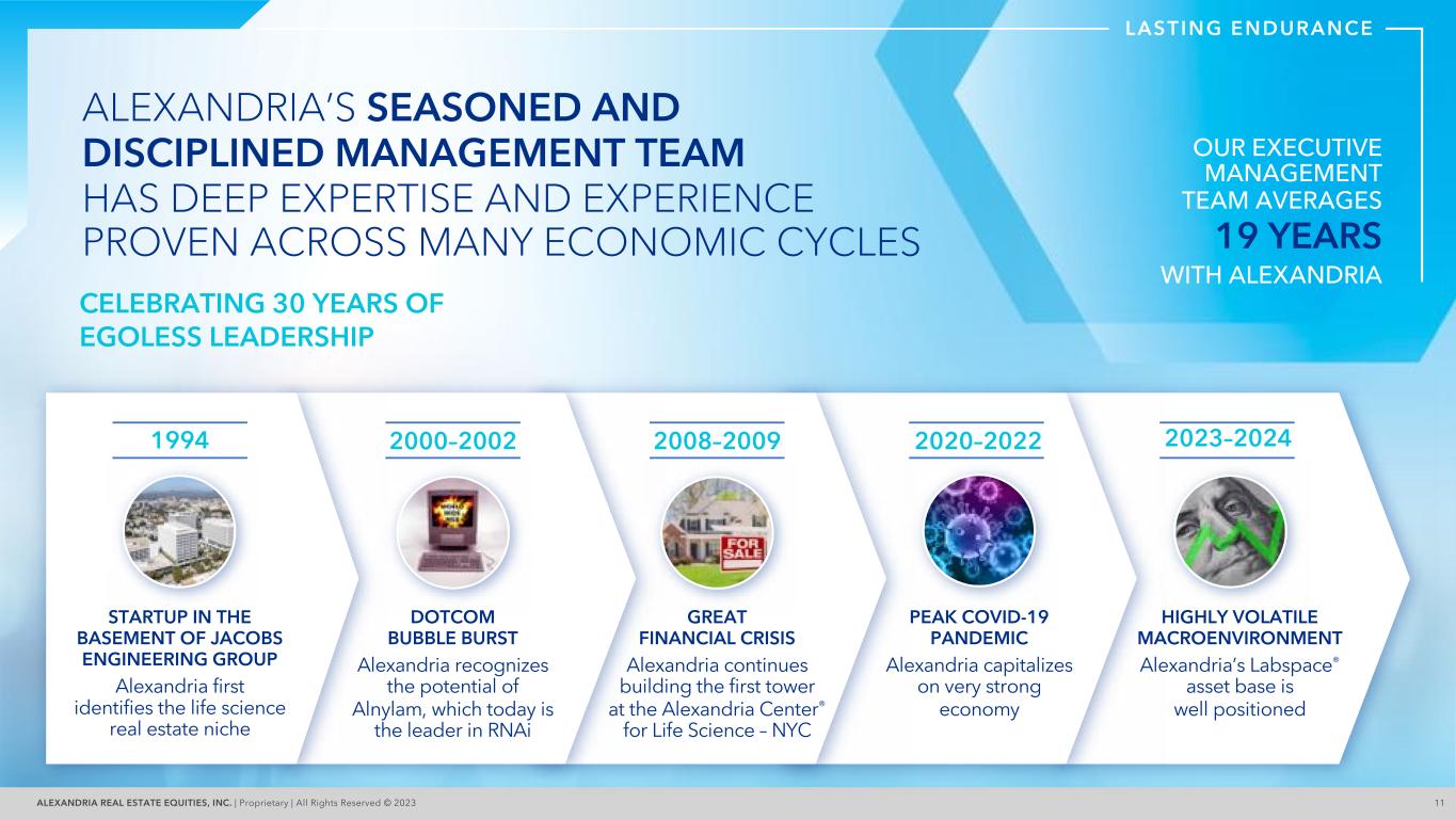10ALEXANDRIA REAL ESTATE EQUITIES, INC. | Proprietary | All Rights Reserved © 2023 From our humble beginnings in basement offices at Jacobs Engineering in 1994, Alexandria will celebrate the 30th anniversary of our one-of-a-kind, once-in-a-generation company on January 5, 2024. LASTING ENDURANCE ALEXANDRIA: 2024 CELEBRATING 30 YEARS AT THE VANGUARD AND HEART OF THE LIFE SCIENCE ECOSYSTEM™ PROUD OF THE PAST. LASER FOCUSED ON THE PRESENT. STRATEGICALLY PREPARED FOR THE FUTURE. PEOPLE. PASSION. PURPOSE.