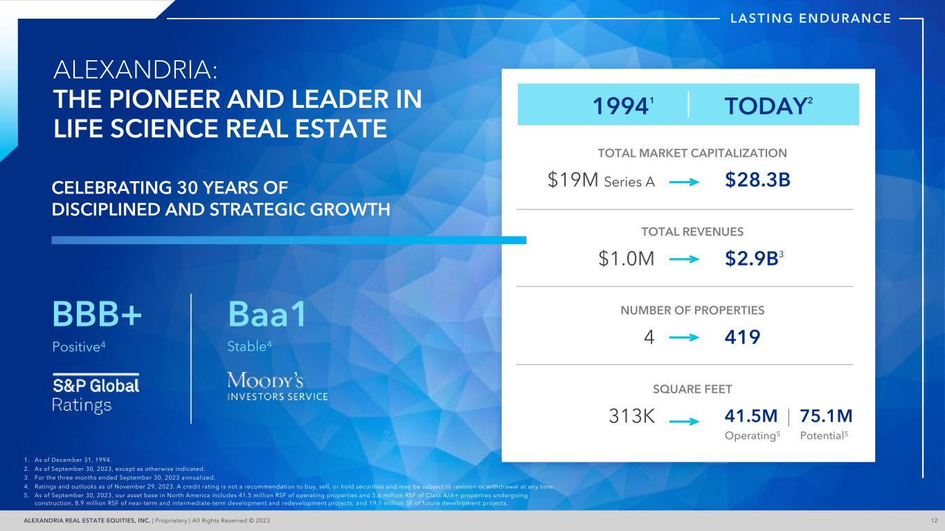 11ALEXANDRIA REAL ESTATE EQUITIES, INC. | Proprietary | All Rights Reserved © 2023 STARTUP IN THE BASEMENT OF JACOBS ENGINEERING GROUP Alexandria first identifies the life science real estate niche LASTING ENDURANCE DOTCOM BUBBLE BURST Alexandria recognizes the potential of Alnylam, which today is the leader in RNAi GREAT FINANCIAL CRISIS Alexandria continues building the first tower at the Alexandria Center® for Life Science – NYC PEAK COVID-19 PANDEMIC Alexandria capitalizes on very strong economy HIGHLY VOLATILE MACROENVIRONMENT Alexandria’s Labspace® asset base is well positioned 1994 2000–2002 2008–2009 2020–2022 2023–2024 ALEXANDRIA’S SEASONED AND DISCIPLINED MANAGEMENT TEAM HAS DEEP EXPERTISE AND EXPERIENCE PROVEN ACROSS MANY ECONOMIC CYCLES OUR EXECUTIVE MANAGEMENT TEAM AVERAGES 19 YEARS WITH ALEXANDRIA CELEBRATING 30 YEARS OF EGOLESS LEADERSHIP