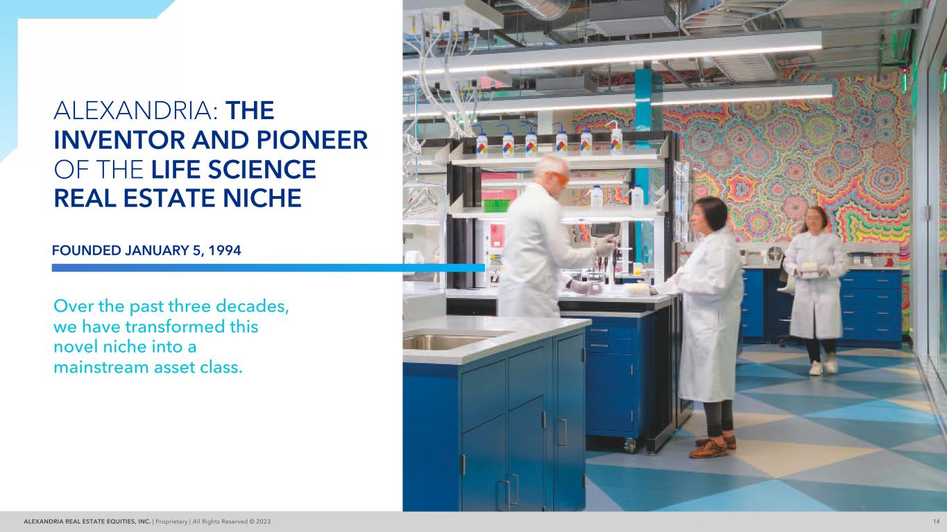 13ALEXANDRIA REAL ESTATE EQUITIES, INC. | Proprietary | All Rights Reserved © 2023 ALEXANDRIA WAS FOUNDED AT THE BEGINNING OF THE BIOLOGY REVOLUTION NASDAQ BIOTECH INDEX (NBI)1 LASTING ENDURANCE 1994 1995 1996 1997 1998 1999 2000 2001 2002 2003 2004 2005 2006 2007 2008 2009 2010 2011 2012 2013 2014 2015 2016 2017 2018 2019 2020 2021 2022 3Q23 20x INCREASE OVER THE LAST 30 Years “The biggest innovations of the 21st century will be at the intersection of biology and technology.” STEVE JOBS 1. Source: S&P Capital IQ.