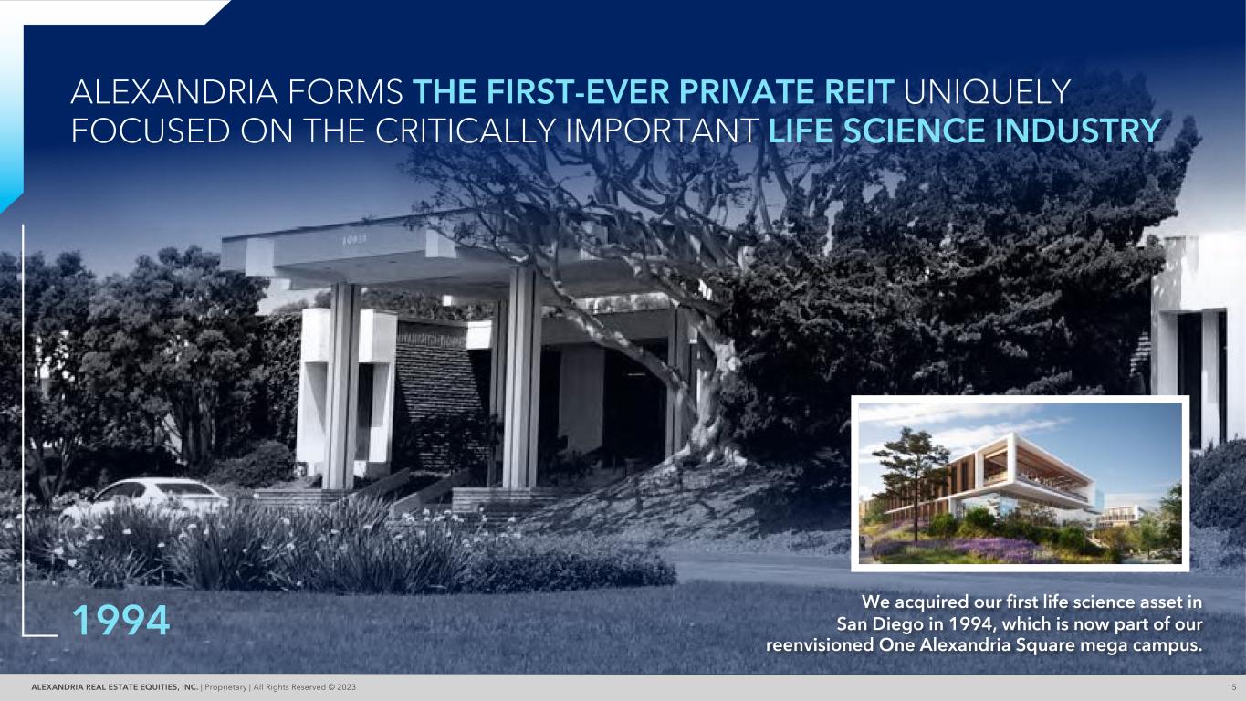 14ALEXANDRIA REAL ESTATE EQUITIES, INC. | Proprietary | All Rights Reserved © 2023 1. As of December 31, 1994. 2. As of September 30, 2022. Over the past three decades, we have transformed this novel niche into a mainstream asset class. ALEXANDRIA: THE INVENTOR AND PIONEER OF THE LIFE SCIENCE REAL ESTATE NICHE FOUNDED JANUARY 5, 1994