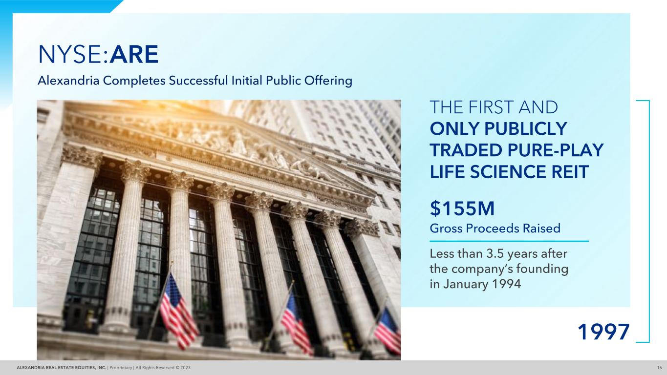 15ALEXANDRIA REAL ESTATE EQUITIES, INC. | Proprietary | All Rights Reserved © 2023 We acquired our first life science asset in San Diego in 1994, which is now part of our reenvisioned One Alexandria Square mega campus. ALEXANDRIA FORMS THE FIRST-EVER PRIVATE REIT UNIQUELY FOCUSED ON THE CRITICALLY IMPORTANT LIFE SCIENCE INDUSTRY 1994