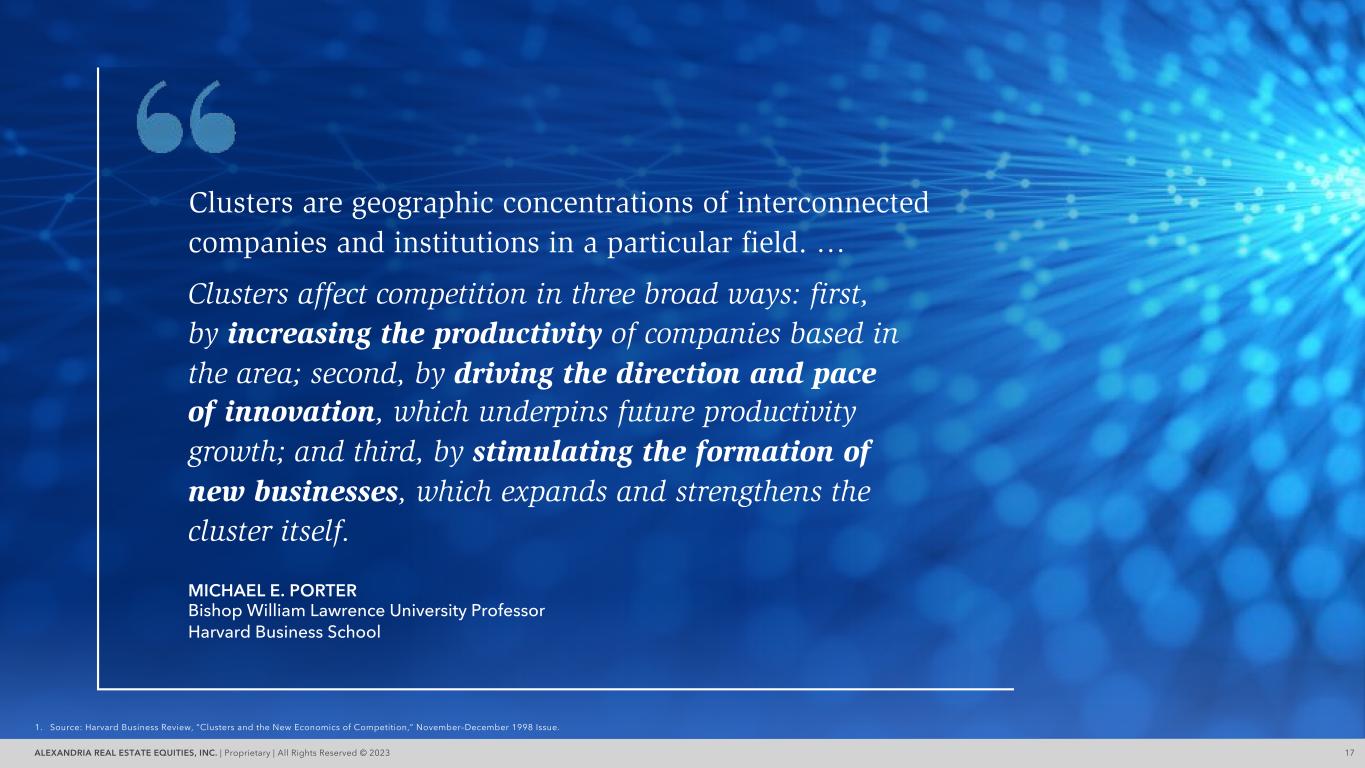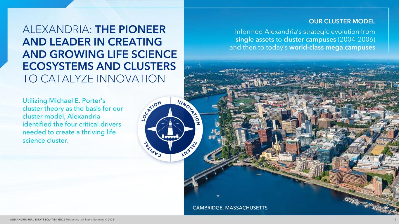 17ALEXANDRIA REAL ESTATE EQUITIES, INC. | Proprietary | All Rights Reserved © 2023 1. Source: Harvard Business Review, “Clusters and the New Economics of Competition,” November–December 1998 Issue. Clusters are geographic concentrations of interconnected companies and institutions in a particular field. … Clusters affect competition in three broad ways: first, by increasing the productivity of companies based in the area; second, by driving the direction and pace of innovation, which underpins future productivity growth; and third, by stimulating the formation of new businesses, which expands and strengthens the cluster itself. MICHAEL E. PORTER Bishop William Lawrence University Professor Harvard Business School