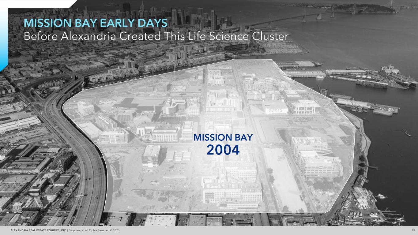 18ALEXANDRIA REAL ESTATE EQUITIES, INC. | Proprietary | All Rights Reserved © 2023 Utilizing Michael E. Porter’s cluster theory as the basis for our cluster model, Alexandria identified the four critical drivers needed to create a thriving life science cluster. ALEXANDRIA: THE PIONEER AND LEADER IN CREATING AND GROWING LIFE SCIENCE ECOSYSTEMS AND CLUSTERS TO CATALYZE INNOVATION OUR CLUSTER MODEL Informed Alexandria’s strategic evolution from single assets to cluster campuses (2004–2006) and then to today’s world-class mega campuses CAMBRIDGE, MASSACHUSETTS