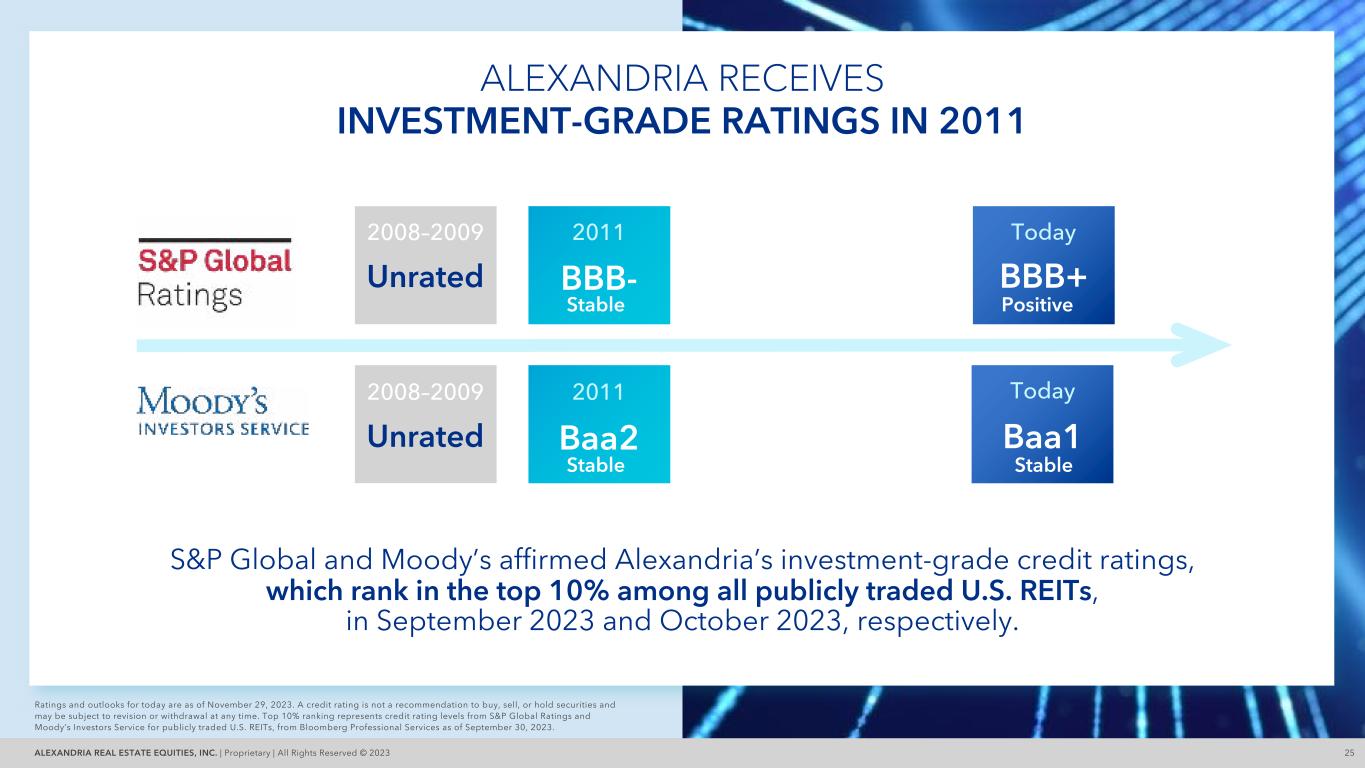 25ALEXANDRIA REAL ESTATE EQUITIES, INC. | Proprietary | All Rights Reserved © 2023 ALEXANDRIA RECEIVES INVESTMENT-GRADE RATINGS IN 2011 S&P Global and Moody’s affirmed Alexandria’s investment-grade credit ratings, which rank in the top 10% among all publicly traded U.S. REITs, in September 2023 and October 2023, respectively. 2011 Baa2 Today Baa1 Today 2011 BBB- BBB+ PositiveStable Stable Stable 2008–2009 Unrated 2008–2009 Unrated Ratings and outlooks for today are as of November 29, 2023. A credit rating is not a recommendation to buy, sell, or hold securities and may be subject to revision or withdrawal at any time. Top 10% ranking represents credit rating levels from S&P Global Ratings and Moody’s Investors Service for publicly traded U.S. REITs, from Bloomberg Professional Services as of September 30, 2023.