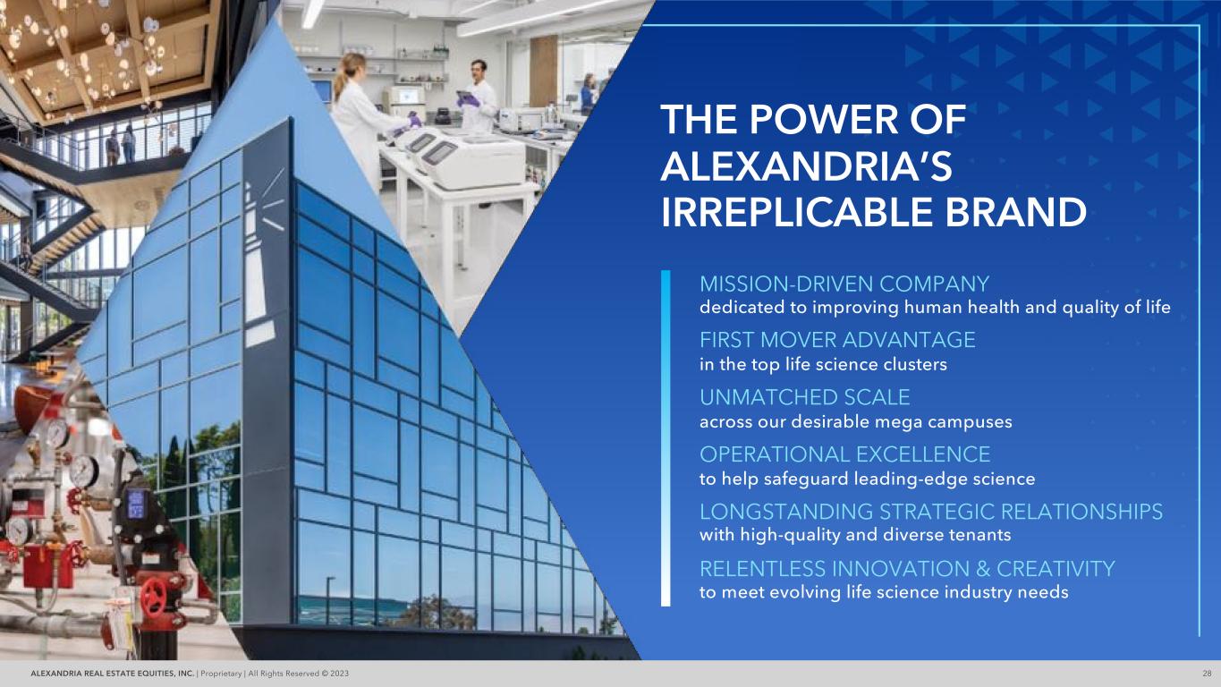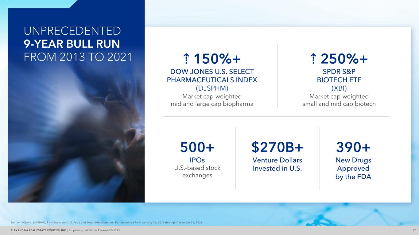 27ALEXANDRIA REAL ESTATE EQUITIES, INC. | Proprietary | All Rights Reserved © 2023 Source: YCharts, NASDAQ, PitchBook, and U.S. Food and Drug Administration. For the period from January 13, 2013 through December 31, 2021. ⇡ 150%+ DOW JONES U.S. SELECT PHARMACEUTICALS INDEX (DJSPHM) Market cap-weighted mid and large cap biopharma ⇡ 250%+ SPDR S&P BIOTECH ETF (XBI) Market cap-weighted small and mid cap biotech 500+ IPOs U.S.-based stock exchanges $270B+ Venture Dollars Invested in U.S. 390+ New Drugs Approved by the FDA UNPRECEDENTED 9-YEAR BULL RUN FROM 2013 TO 2021