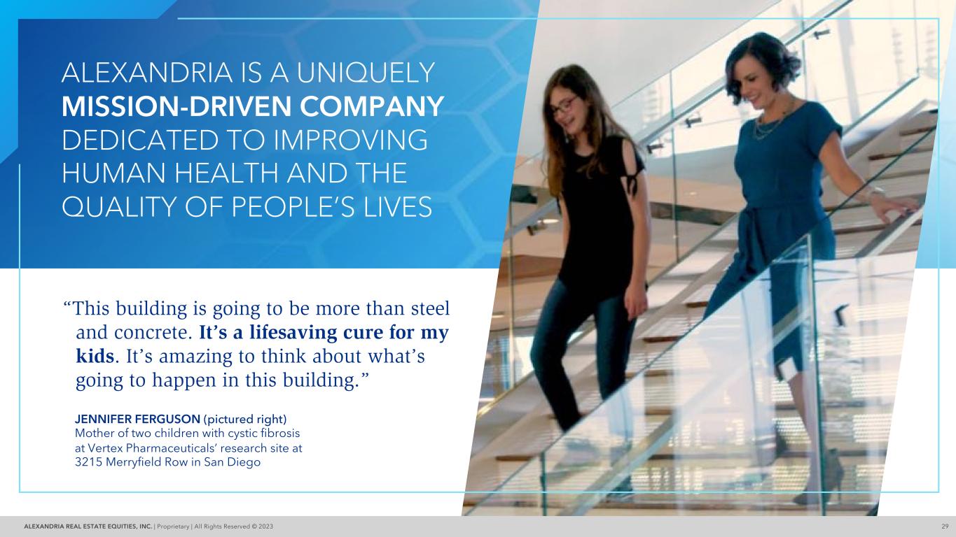 29ALEXANDRIA REAL ESTATE EQUITIES, INC. | Proprietary | All Rights Reserved © 2023 ALEXANDRIA IS A UNIQUELY MISSION-DRIVEN COMPANY DEDICATED TO IMPROVING HUMAN HEALTH AND THE QUALITY OF PEOPLE’S LIVES “This building is going to be more than steel and concrete. It’s a lifesaving cure for my kids. It’s amazing to think about what’s going to happen in this building.” JENNIFER FERGUSON (pictured right) Mother of two children with cystic fibrosis at Vertex Pharmaceuticals’ research site at 3215 Merryfield Row in San Diego