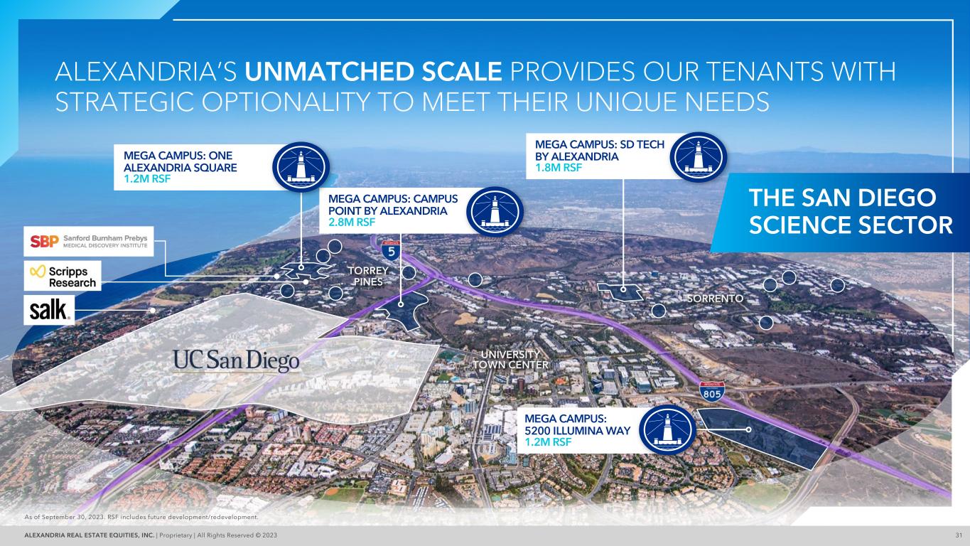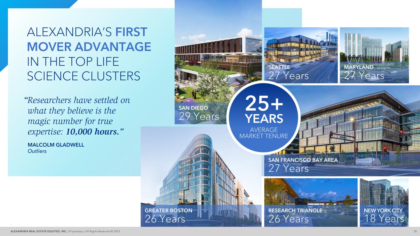 30ALEXANDRIA REAL ESTATE EQUITIES, INC. | Proprietary | All Rights Reserved © 2023 ALEXANDRIA’S FIRST MOVER ADVANTAGE IN THE TOP LIFE SCIENCE CLUSTERS . SAN DIEGO 29 Years SEATTLE 27 Years MARYLAND 27 Years GREATER BOSTON 26 Years RESEARCH TRIANGLE 26 Years NEW YORK CITY 18 Years “Researchers have settled on what they believe is the magic number for true expertise: 10,000 hours.” MALCOLM GLADWELL Outliers SAN FRANCISCO BAY AREA 27 Years 25+ YEARS AVERAGE MARKET TENURE