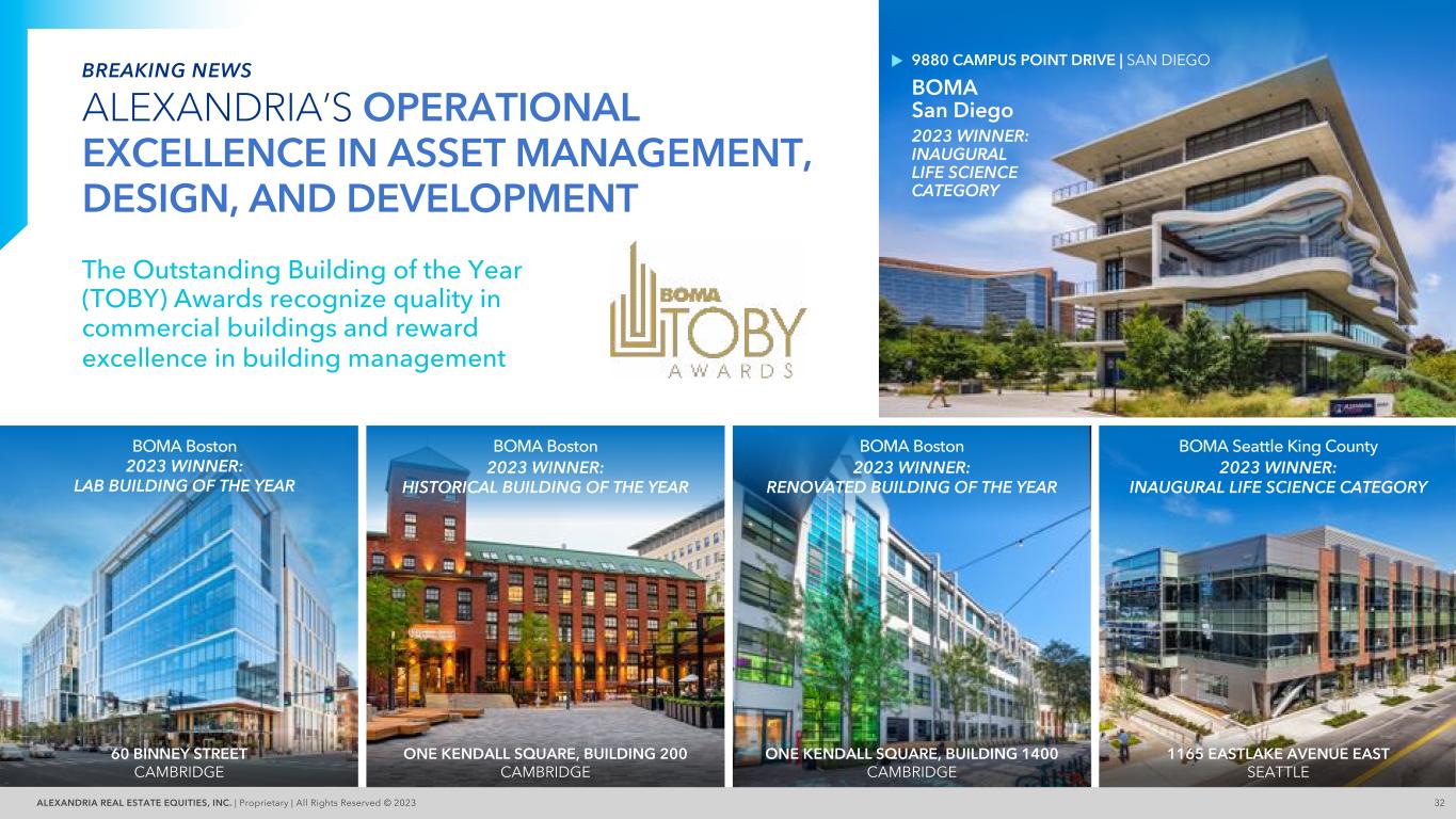 32ALEXANDRIA REAL ESTATE EQUITIES, INC. | Proprietary | All Rights Reserved © 2023 ALEXANDRIA’S OPERATIONAL EXCELLENCE IN ASSET MANAGEMENT, DESIGN, AND DEVELOPMENT The Outstanding Building of the Year (TOBY) Awards recognize quality in commercial buildings and reward excellence in building management BOMA Boston 2023 WINNER: HISTORICAL BUILDING OF THE YEAR ONE KENDALL SQUARE, BUILDING 200 CAMBRIDGE BOMA Seattle King County 2023 WINNER: INAUGURAL LIFE SCIENCE CATEGORY 1165 EASTLAKE AVENUE EAST SEATTLE BOMA Boston 2023 WINNER: LAB BUILDING OF THE YEAR 60 BINNEY STREET CAMBRIDGE BOMA Boston 2023 WINNER: RENOVATED BUILDING OF THE YEAR ONE KENDALL SQUARE, BUILDING 1400 CAMBRIDGE BOMA San Diego 2023 WINNER: INAUGURAL LIFE SCIENCE CATEGORY 9880 CAMPUS POINT DRIVE | SAN DIEGO BREAKING NEWS