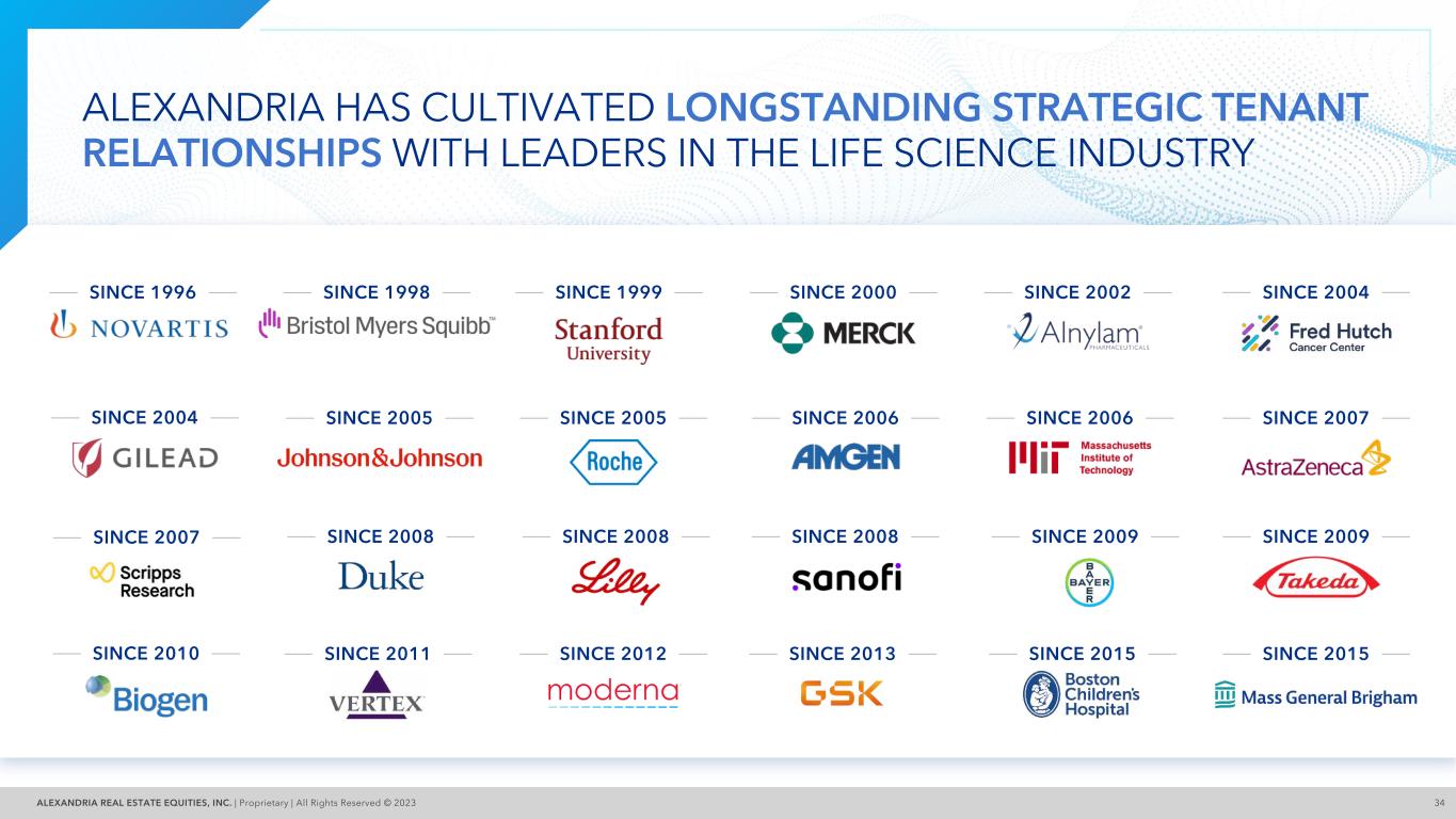 34ALEXANDRIA REAL ESTATE EQUITIES, INC. | Proprietary | All Rights Reserved © 2023 ALEXANDRIA HAS CULTIVATED LONGSTANDING STRATEGIC TENANT RELATIONSHIPS WITH LEADERS IN THE LIFE SCIENCE INDUSTRY SINCE 1996 SINCE 2002 SINCE 2012 SINCE 1998 SINCE 2004 SINCE 2005 SINCE 2008 SINCE 2008 SINCE 2000 SINCE 2006 SINCE 1999 SINCE 2009 SINCE 2015SINCE 2010 SINCE 2005 SINCE 2007SINCE 2006 SINCE 2008 SINCE 2013SINCE 2011 SINCE 2009SINCE 2007 SINCE 2015 SINCE 2004