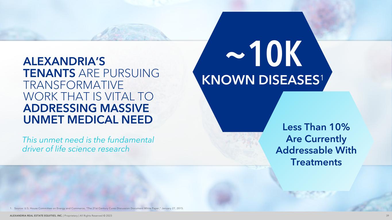 39ALEXANDRIA REAL ESTATE EQUITIES, INC. | Proprietary | All Rights Reserved © 2023 1. Source: U.S. House Committee on Energy and Commerce, “The 21st Century Cures Discussion Document White Paper,” January 27, 2015. ALEXANDRIA’S TENANTS ARE PURSUING TRANSFORMATIVE WORK THAT IS VITAL TO ADDRESSING MASSIVE UNMET MEDICAL NEED ~10K KNOWN DISEASES1 Less Than 10% Are Currently Addressable With Treatments This unmet need is the fundamental driver of life science research