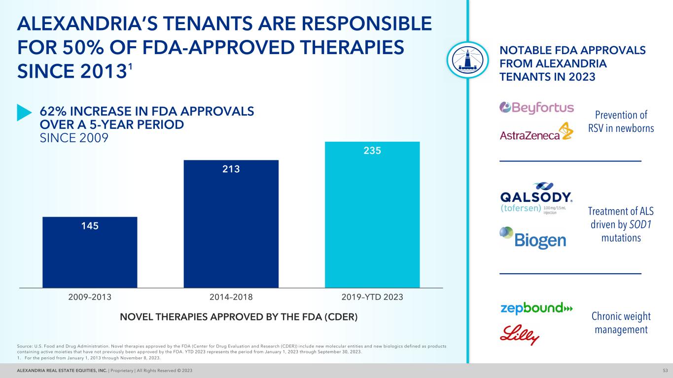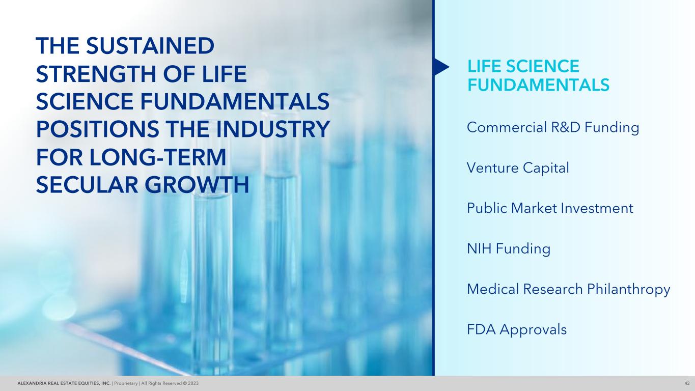 41ALEXANDRIA REAL ESTATE EQUITIES, INC. | Proprietary | All Rights Reserved © 2023 ALEXANDRIA IS HONORED TO PARTNER WITH COMPANIES AT THE FOREFRONT OF INNOVATION ADVANCING NOVEL MEDICINES TO PREVENT, TREAT, AND CURE DISEASE 235+ Approved FDA therapies developed by Alexandria tenants since 20133 2,500+ Clinical trials currently sponsored by Alexandria tenants2 $150B+ R&D spend by Alexandria’s public biotech and pharma tenants in 20221 Building the Future of Life-Changing Innovation® 1. Source: Evaluate Pharma, November 2023. 2. Source: BCIQ. As of September 30, 2023. 3. Source: U.S. Food and Drug Administration. Novel therapies approved by the FDA (Center for Drug Evaluation and Research (CDER)) include new molecular entities and new biologics defined as products containing active moieties that have not previously been approved by the FDA. For the period from January 1, 2013 through November 8, 2023.