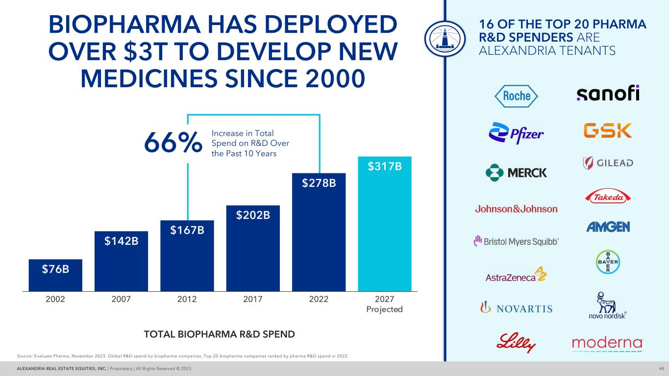 43ALEXANDRIA REAL ESTATE EQUITIES, INC. | Proprietary | All Rights Reserved © 2023 TOTAL LIFE SCIENCE R&D FUNDING $2.1T+ 2018–2022 $450B+ IN 2022 $278B $77B $53B $51B STRONG AND DIVERSE FUNDING SOURCES FUEL DEMAND FOR ALEXANDRIA’S LABSPACE® ASSETS 1. Source: Evaluate Pharma, October 2023. 2. Sources: PitchBook, BioCentury, and NASDAQ. Public markets include IPOs, follow-ons, and public equity financings. 3. Sources: Congressional Research Service, “National Institutes of Health (NIH) Funding: FY1996-FY2024,” updated May 17, 2023; National Science Foundation (NSF), "Fiscal Year 2022 Appropriations." 4. Source: The Giving Institute, “Giving USA 2023: The Annual Report on Philanthropy for the Year 2022.” Government Funding (NIH & NSF) 3 U.S. Medical Research Philanthropy 4 Global Public Biopharma R&D Spending1 U.S. Life Science Venture Capital and Public Markets2 2022 LIFE SCIENCE R&D FUNDING BY SOURCE