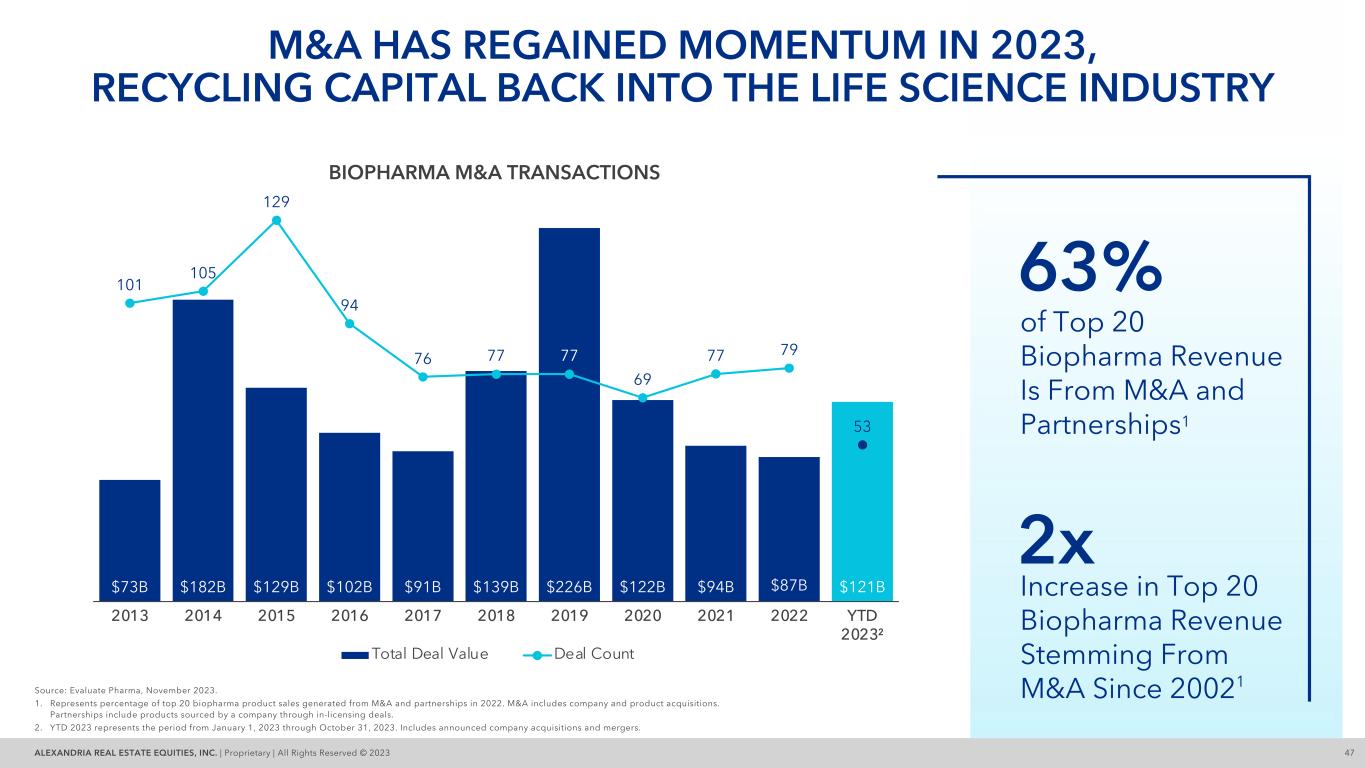 46ALEXANDRIA REAL ESTATE EQUITIES, INC. | Proprietary | All Rights Reserved © 2023 BIOPHARMA HAS SIGNIFICANT CAPITAL TO DEPLOY TOWARD INNOVATIVE NEW MEDICINES M&A FIREPOWER OF TOP 20 PHARMA $1.1T Source: Stifel, "Biopharmaceutical Sector Weekly Update," October 23, 2023.