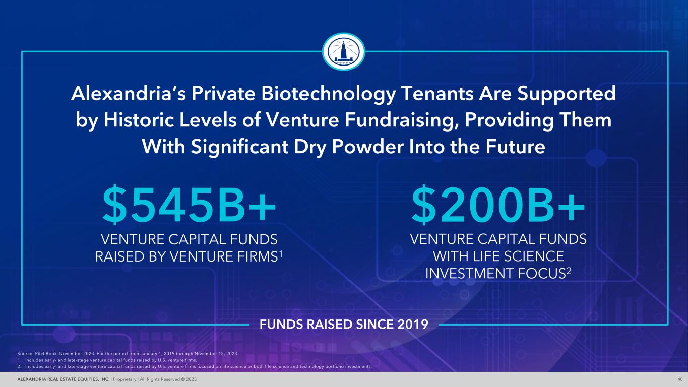 48ALEXANDRIA REAL ESTATE EQUITIES, INC. | Proprietary | All Rights Reserved © 2023 $545B+ VENTURE CAPITAL FUNDS RAISED BY VENTURE FIRMS1 $200B+ VENTURE CAPITAL FUNDS WITH LIFE SCIENCE INVESTMENT FOCUS2 FUNDS RAISED SINCE 2019 Alexandria’s Private Biotechnology Tenants Are Supported by Historic Levels of Venture Fundraising, Providing Them With Significant Dry Powder Into the Future Source: PitchBook, November 2023. For the period from January 1, 2019 through November 15, 2023. 1. Includes early- and late-stage venture capital funds raised by U.S. venture firms. 2. Includes early- and late-stage venture capital funds raised by U.S. venture firms focused on life science or both life science and technology portfolio investments.