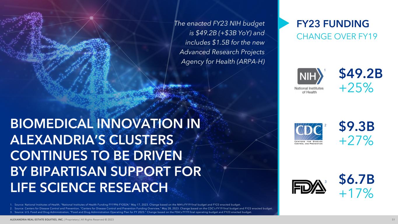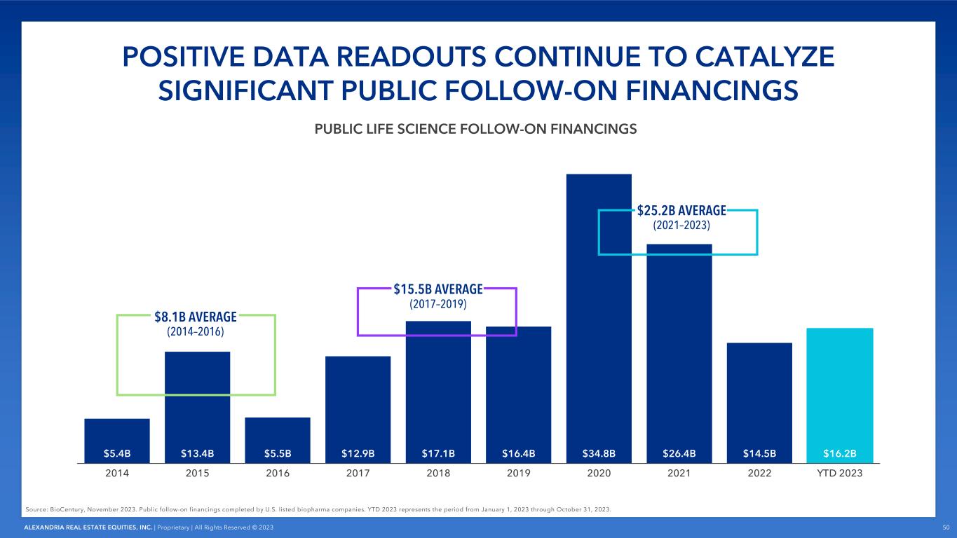 50ALEXANDRIA REAL ESTATE EQUITIES, INC. | Proprietary | All Rights Reserved © 2023 $5.4B $13.4B $5.5B $12.9B $17.1B $16.4B $34.8B $26.4B $14.5B $16.2B 2014 2015 2016 2017 2018 2019 2020 2021 2022 YTD 2023 Source: BioCentury, November 2023. Public follow-on financings completed by U.S. listed biopharma companies. YTD 2023 represents the period from January 1, 2023 through October 31, 2023. POSITIVE DATA READOUTS CONTINUE TO CATALYZE SIGNIFICANT PUBLIC FOLLOW-ON FINANCINGS PUBLIC LIFE SCIENCE FOLLOW-ON FINANCINGS $8.1B AVERAGE (2014–2016) $15.5B AVERAGE (2017–2019) $25.2B AVERAGE (2021–2023)