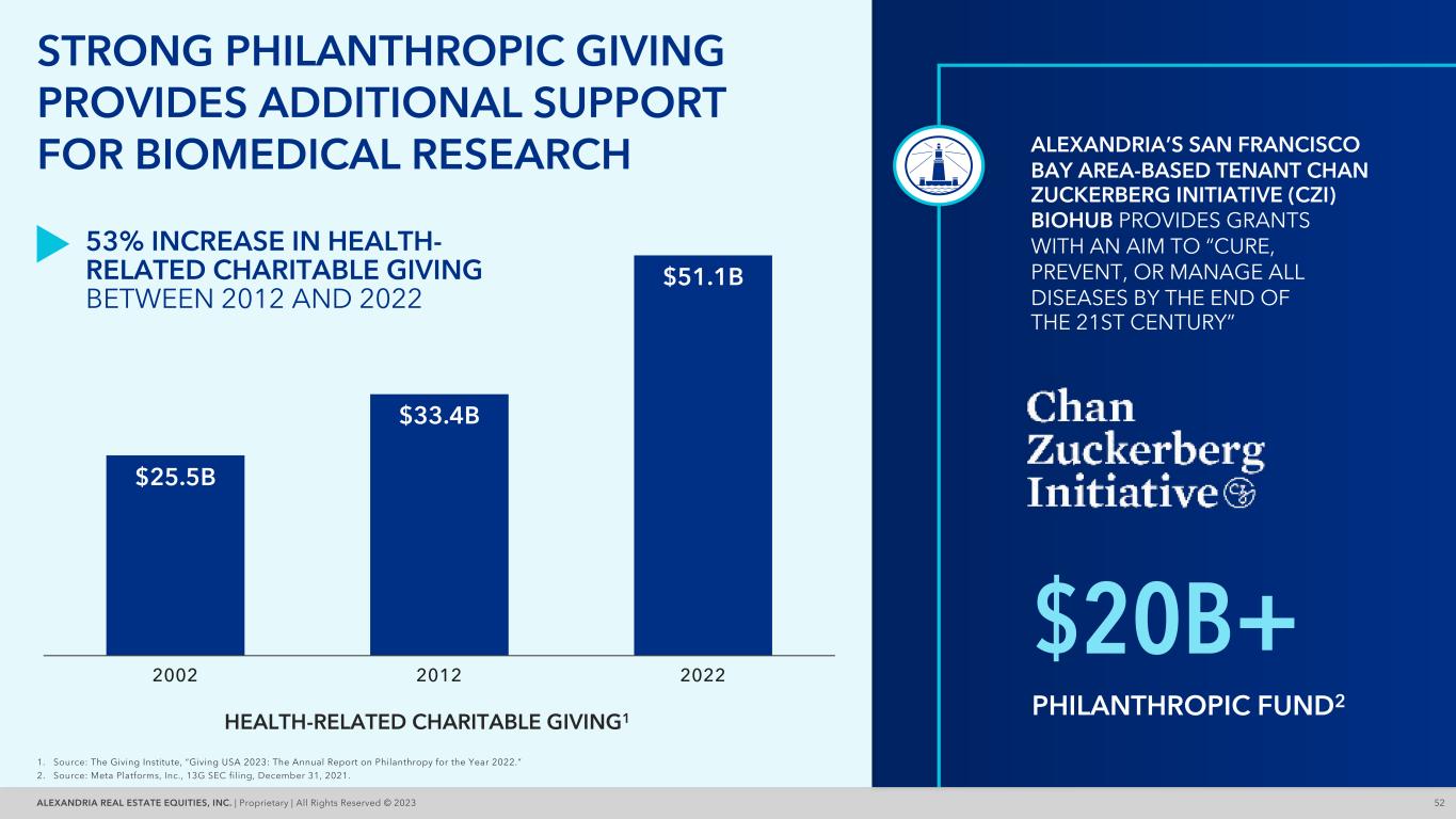 52ALEXANDRIA REAL ESTATE EQUITIES, INC. | Proprietary | All Rights Reserved © 2023 STRONG PHILANTHROPIC GIVING PROVIDES ADDITIONAL SUPPORT FOR BIOMEDICAL RESEARCH 1. Source: The Giving Institute, “Giving USA 2023: The Annual Report on Philanthropy for the Year 2022.” 2. Source: Meta Platforms, Inc., 13G SEC filing, December 31, 2021. $25.5B $33.4B $51.1B 2002 2012 2022 HEALTH-RELATED CHARITABLE GIVING1 53% INCREASE IN HEALTH- RELATED CHARITABLE GIVING BETWEEN 2012 AND 2022 ALEXANDRIA’S SAN FRANCISCO BAY AREA-BASED TENANT CHAN ZUCKERBERG INITIATIVE (CZI) BIOHUB PROVIDES GRANTS WITH AN AIM TO “CURE, PREVENT, OR MANAGE ALL DISEASES BY THE END OF THE 21ST CENTURY” $20B+ PHILANTHROPIC FUND2