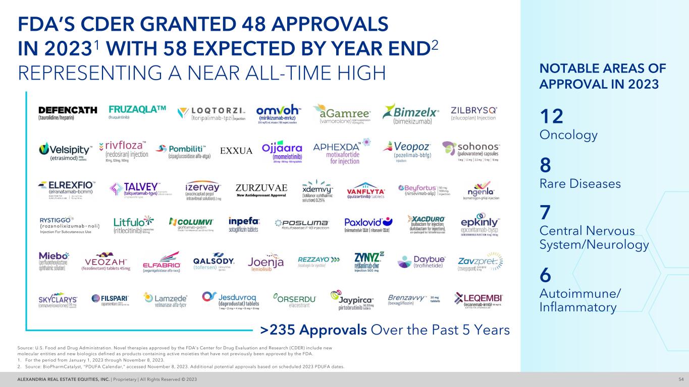 53ALEXANDRIA REAL ESTATE EQUITIES, INC. | Proprietary | All Rights Reserved © 2023 ALEXANDRIA’S TENANTS ARE RESPONSIBLE FOR 50% OF FDA-APPROVED THERAPIES SINCE 20131 Source: U.S. Food and Drug Administration. Novel therapies approved by the FDA (Center for Drug Evaluation and Research (CDER)) include new molecular entities and new biologics defined as products containing active moieties that have not previously been approved by the FDA. YTD 2023 represents the period from January 1, 2023 through September 30, 2023. 1. For the period from January 1, 2013 through November 8, 2023. NOTABLE FDA APPROVALS FROM ALEXANDRIA TENANTS IN 2023 145 213 235 2009–2013 2014–2018 2019–YTD 2023 NOVEL THERAPIES APPROVED BY THE FDA (CDER) Prevention of RSV in newborns Treatment of ALS driven by SOD1 mutations Chronic weight management 62% INCREASE IN FDA APPROVALS OVER A 5-YEAR PERIOD SINCE 2009