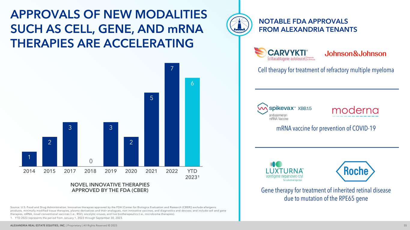 54ALEXANDRIA REAL ESTATE EQUITIES, INC. | Proprietary | All Rights Reserved © 2023 FDA’S CDER GRANTED 48 APPROVALS IN 20231 WITH 58 EXPECTED BY YEAR END2 REPRESENTING A NEAR ALL-TIME HIGH >235 Approvals Over the Past 5 Years NOTABLE AREAS OF APPROVAL IN 2023 8 Rare Diseases 6 Autoimmune/ Inflammatory 7 Central Nervous System/Neurology 12 Oncology Source: U.S. Food and Drug Administration. Novel therapies approved by the FDA’s Center for Drug Evaluation and Research (CDER) include new molecular entities and new biologics defined as products containing active moieties that have not previously been approved by the FDA. 1. For the period from January 1, 2023 through November 8, 2023. 2. Source: BioPharmCatalyst, “PDUFA Calendar,” accessed November 8, 2023. Additional potential approvals based on scheduled 2023 PDUFA dates.