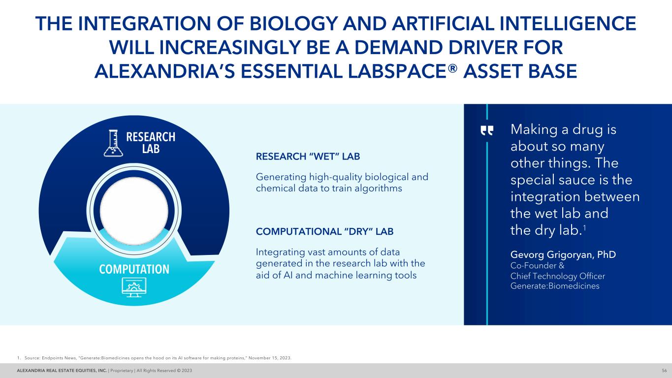 56ALEXANDRIA REAL ESTATE EQUITIES, INC. | Proprietary | All Rights Reserved © 2023 THE INTEGRATION OF BIOLOGY AND ARTIFICIAL INTELLIGENCE WILL INCREASINGLY BE A DEMAND DRIVER FOR ALEXANDRIA’S ESSENTIAL LABSPACE® ASSET BASE 1. Source: Endpoints News, “Generate:Biomedicines opens the hood on its AI software for making proteins,” November 15, 2023. COMPUTATIONAL “DRY” LAB Integrating vast amounts of data generated in the research lab with the aid of AI and machine learning tools RESEARCH “WET” LAB Generating high-quality biological and chemical data to train algorithms Making a drug is about so many other things. The special sauce is the integration between the wet lab and the dry lab.1 Gevorg Grigoryan, PhD Co-Founder & Chief Technology Officer Generate:Biomedicines RESEARCH LAB COMPUTATION