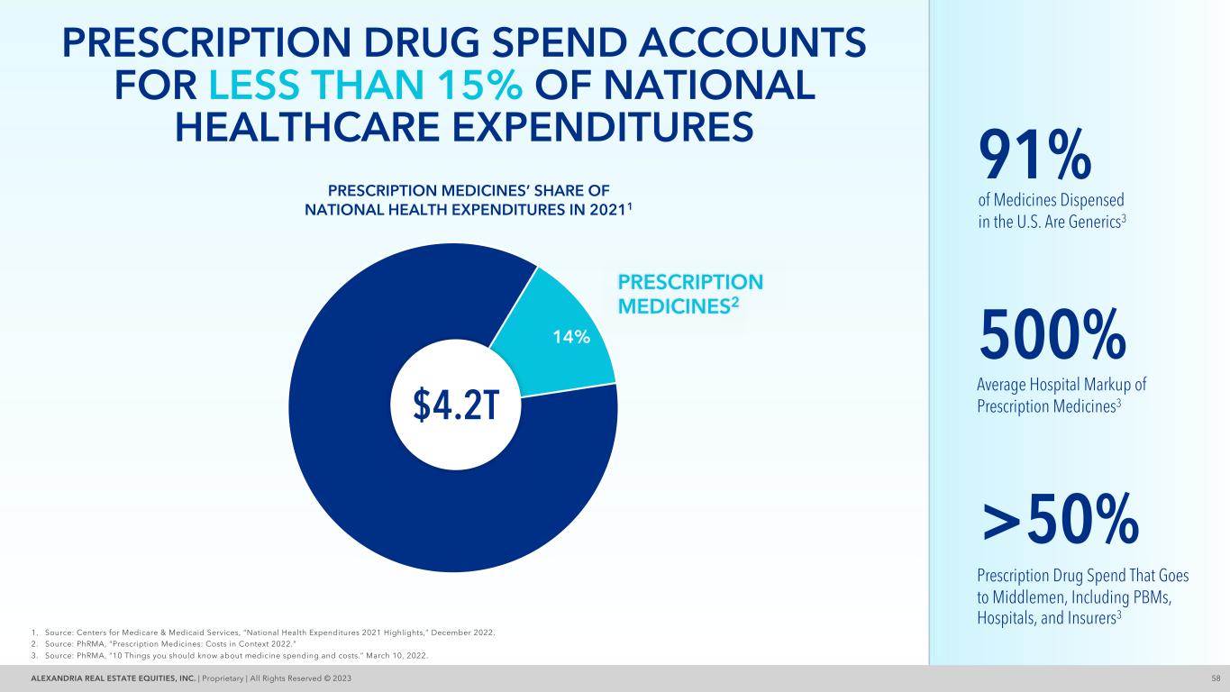 58ALEXANDRIA REAL ESTATE EQUITIES, INC. | Proprietary | All Rights Reserved © 2023 1. Source: Centers for Medicare & Medicaid Services, “National Health Expenditures 2021 Highlights,” December 2022. 2. Source: PhRMA, “Prescription Medicines: Costs in Context 2022.” 3. Source: PhRMA, “10 Things you should know about medicine spending and costs.” March 10, 2022. PRESCRIPTION DRUG SPEND ACCOUNTS FOR LESS THAN 15% OF NATIONAL HEALTHCARE EXPENDITURES 500% Average Hospital Markup of Prescription Medicines3 >50% Prescription Drug Spend That Goes to Middlemen, Including PBMs, Hospitals, and Insurers3 of Medicines Dispensed in the U.S. Are Generics3 91% 14% PRESCRIPTION MEDICINES’ SHARE OF NATIONAL HEALTH EXPENDITURES IN 20211 PRESCRIPTION MEDICINES2 $4.2T