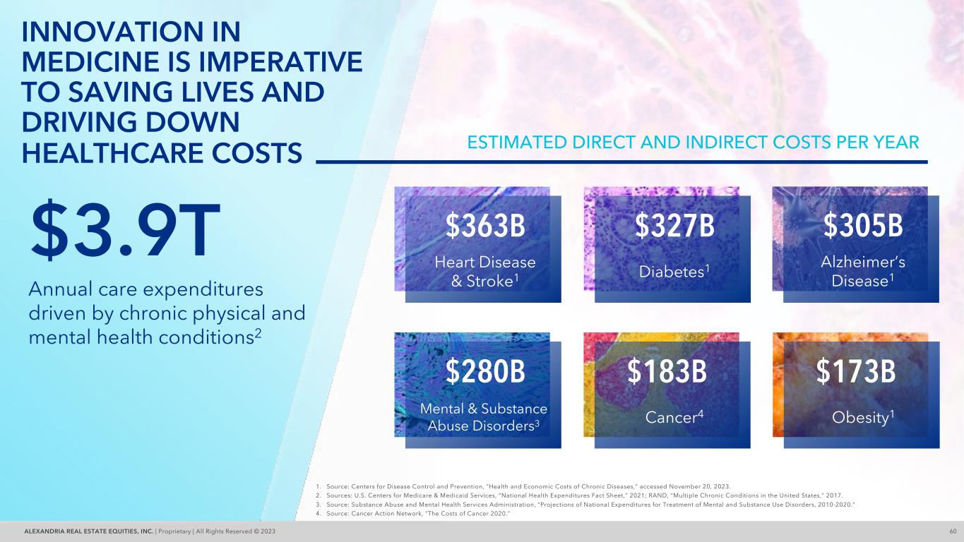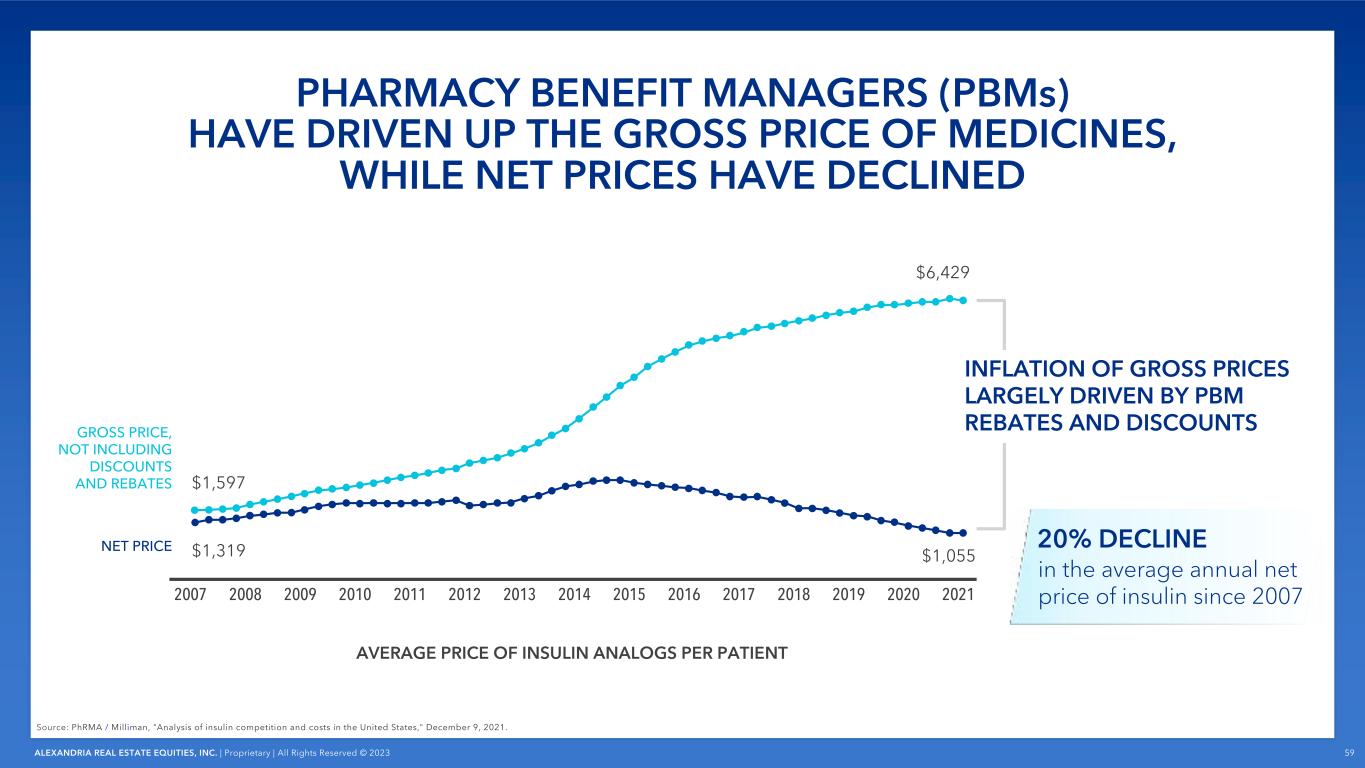 59ALEXANDRIA REAL ESTATE EQUITIES, INC. | Proprietary | All Rights Reserved © 2023 Source: PhRMA / Milliman, "Analysis of insulin competition and costs in the United States," December 9, 2021. PHARMACY BENEFIT MANAGERS (PBMs) HAVE DRIVEN UP THE GROSS PRICE OF MEDICINES, WHILE NET PRICES HAVE DECLINED AVERAGE PRICE OF INSULIN ANALOGS PER PATIENT in the average annual net price of insulin since 2007 20% DECLINE 2007 2008 2009 2010 2011 2012 2013 2014 2015 2016 2017 2018 2019 2020 2021 $1,597 $1,319 $1,055 $6,429 INFLATION OF GROSS PRICES LARGELY DRIVEN BY PBM REBATES AND DISCOUNTSGROSS PRICE, NOT INCLUDING DISCOUNTS AND REBATES NET PRICE