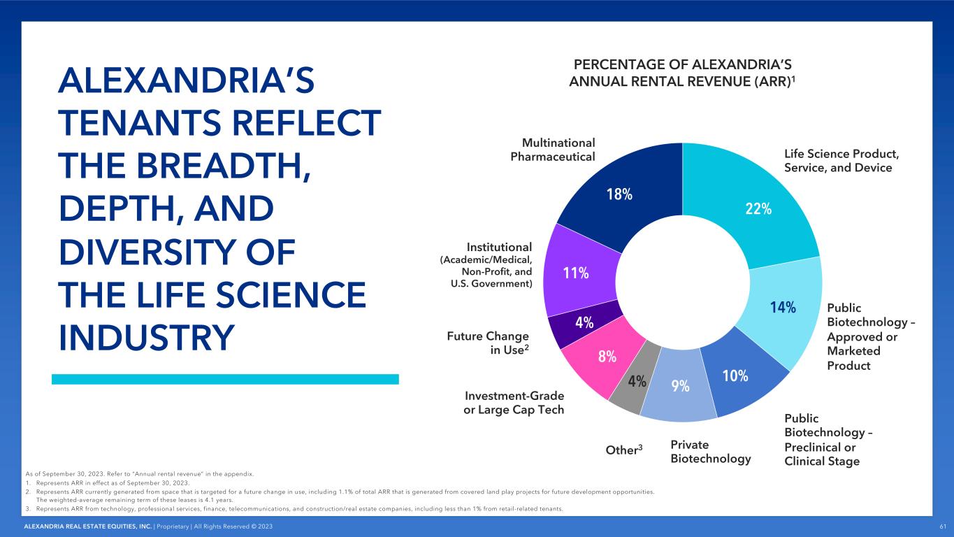 60ALEXANDRIA REAL ESTATE EQUITIES, INC. | Proprietary | All Rights Reserved © 2023 $327B Diabetes1 ESTIMATED DIRECT AND INDIRECT COSTS PER YEAR INNOVATION IN MEDICINE IS IMPERATIVE TO SAVING LIVES AND DRIVING DOWN HEALTHCARE COSTS $3.9T Annual care expenditures driven by chronic physical and mental health conditions2 1. Source: Centers for Disease Control and Prevention, “Health and Economic Costs of Chronic Diseases,” accessed November 20, 2023. 2. Sources: U.S. Centers for Medicare & Medicaid Services, “National Health Expenditures Fact Sheet,” 2021; RAND, “Multiple Chronic Conditions in the United States,” 2017. 3. Source: Substance Abuse and Mental Health Services Administration, “Projections of National Expenditures for Treatment of Mental and Substance Use Disorders, 2010-2020.” 4. Source: Cancer Action Network, “The Costs of Cancer 2020.” $363B Heart Disease & Stroke1 $305B Alzheimer’s Disease1 $280B Mental & Substance Abuse Disorders3 $183B Cancer4 $173B Obesity1