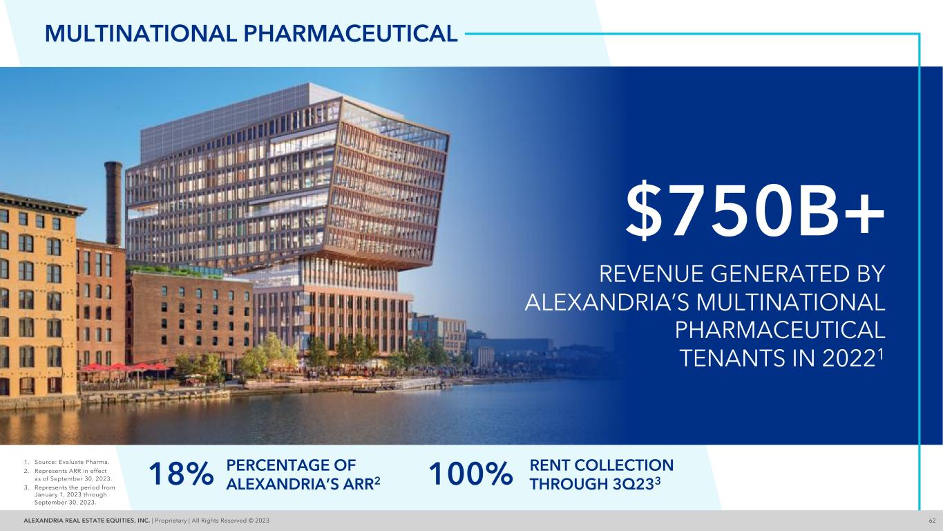 61ALEXANDRIA REAL ESTATE EQUITIES, INC. | Proprietary | All Rights Reserved © 2023 22% 14% 10% 9% 8% 4% 11% 18% Multinational Pharmaceutical Institutional (Academic/Medical, Non-Profit, and U.S. Government) Life Science Product, Service, and Device Private Biotechnology Investment-Grade or Large Cap Tech Public Biotechnology – Approved or Marketed Product Public Biotechnology – Preclinical or Clinical Stage Other3 Future Change in Use2 PERCENTAGE OF ALEXANDRIA’S ANNUAL RENTAL REVENUE (ARR)1 4% As of September 30, 2023. Refer to “Annual rental revenue” in the appendix. 1. Represents ARR in effect as of September 30, 2023. 2. Represents ARR currently generated from space that is targeted for a future change in use, including 1.1% of total ARR that is generated from covered land play projects for future development opportunities. The weighted-average remaining term of these leases is 4.1 years. 3. Represents ARR from technology, professional services, finance, telecommunications, and construction/real estate companies, including less than 1% from retail-related tenants. ALEXANDRIA’S TENANTS REFLECT THE BREADTH, DEPTH, AND DIVERSITY OF THE LIFE SCIENCE INDUSTRY