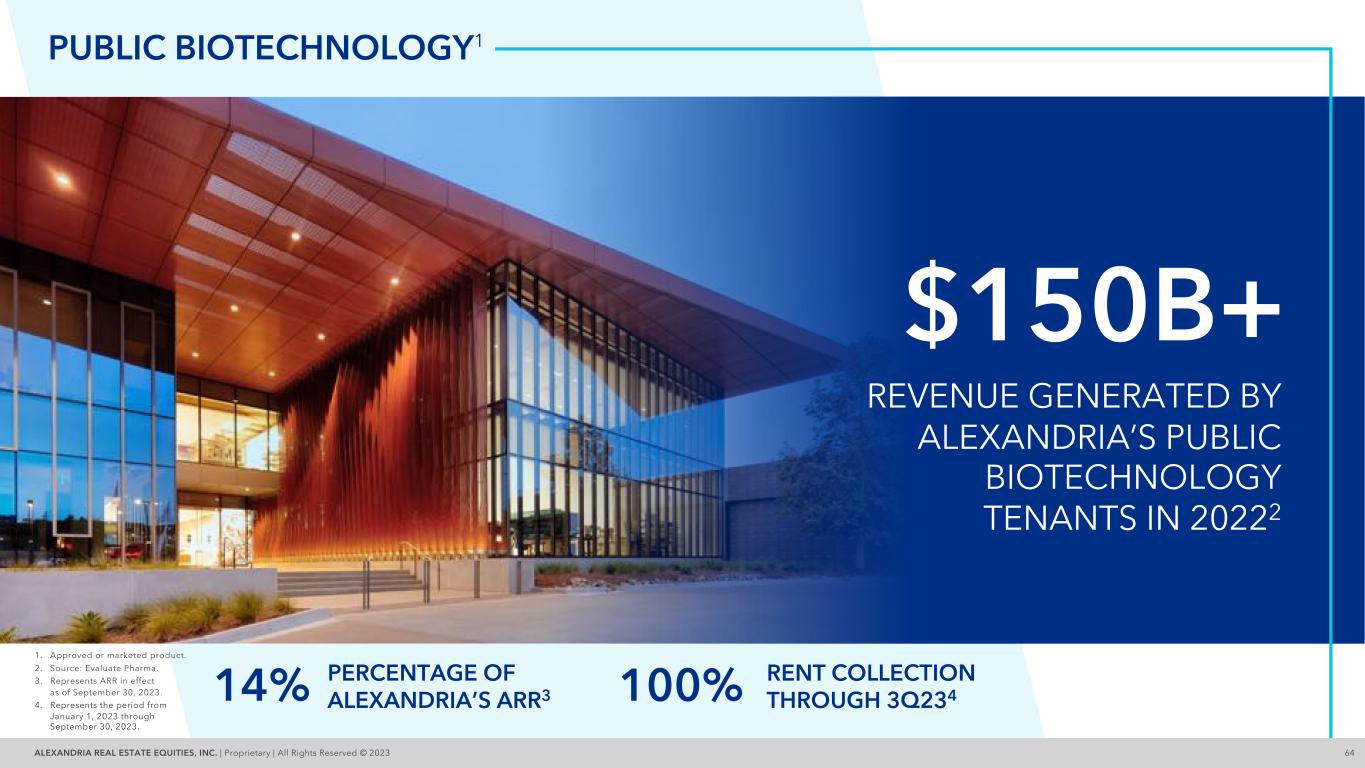 63ALEXANDRIA REAL ESTATE EQUITIES, INC. | Proprietary | All Rights Reserved © 2023 LIFE SCIENCE PRODUCT, SERVICE, AND DEVICE $833B+ REVENUE GENERATED BY ALEXANDRIA’S LIFE SCIENCE PRODUCT, SERVICE, AND DEVICE TENANTS IN 20221 22% PERCENTAGE OF ALEXANDRIA’S ARR2 99.8% RENT COLLECTION THROUGH 3Q233 1. Source: Evaluate Pharma. 2. Represents ARR in effect as of September 30, 2023. 3. Represents the period from January 1, 2023 through September 30, 2023.