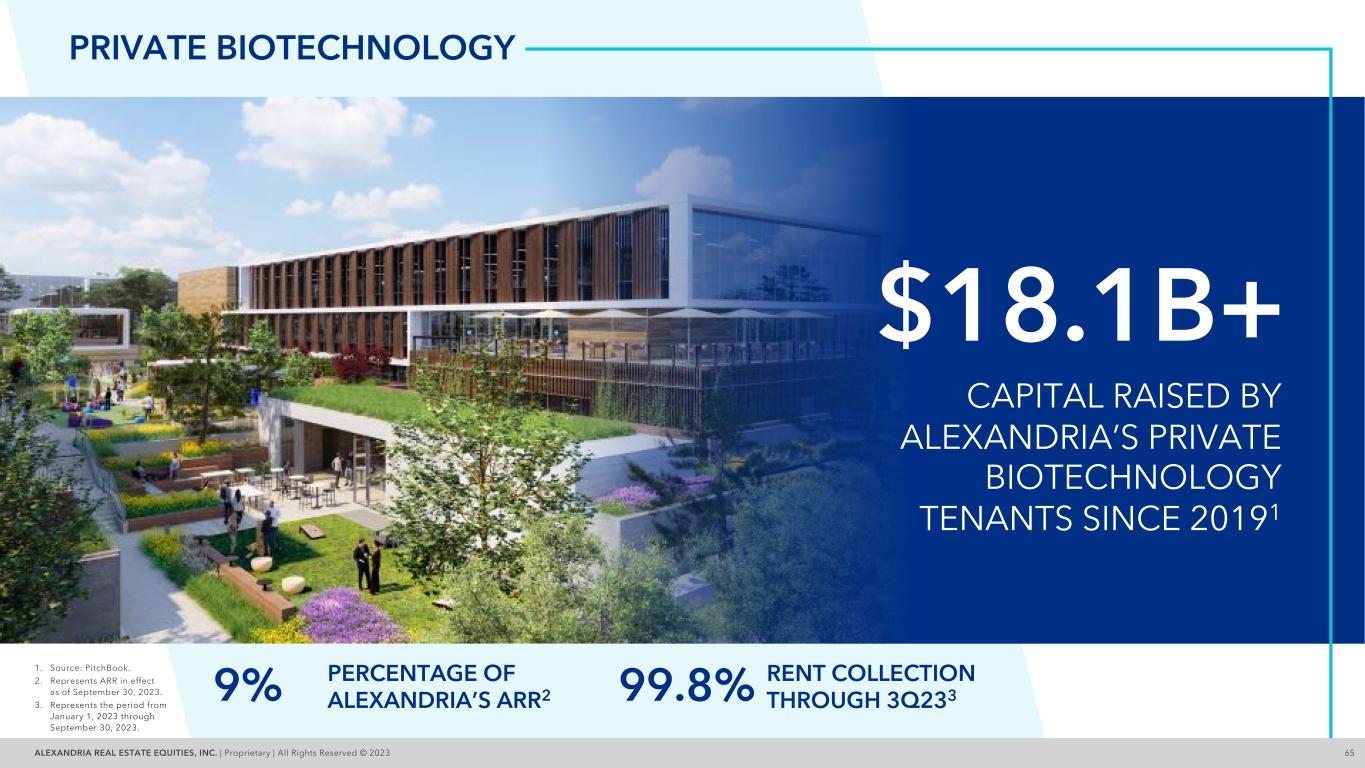 64ALEXANDRIA REAL ESTATE EQUITIES, INC. | Proprietary | All Rights Reserved © 2023 $150B+ REVENUE GENERATED BY ALEXANDRIA’S PUBLIC BIOTECHNOLOGY TENANTS IN 20222 1. Approved or marketed product. 2. Source: Evaluate Pharma. 3. Represents ARR in effect as of September 30, 2023. 4. Represents the period from January 1, 2023 through September 30, 2023. 14% PERCENTAGE OF ALEXANDRIA’S ARR3 100% RENT COLLECTION THROUGH 3Q234 PUBLIC BIOTECHNOLOGY1