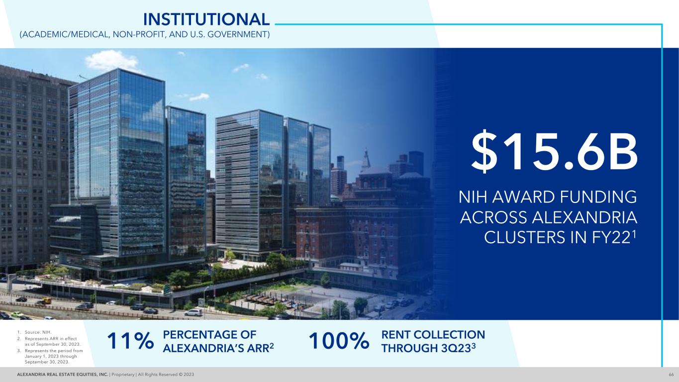 65ALEXANDRIA REAL ESTATE EQUITIES, INC. | Proprietary | All Rights Reserved © 2023 PRIVATE BIOTECHNOLOGY $18.1B+ CAPITAL RAISED BY ALEXANDRIA’S PRIVATE BIOTECHNOLOGY TENANTS SINCE 20191 1. Source: PitchBook. 2. Represents ARR in effect as of September 30, 2023. 3. Represents the period from January 1, 2023 through September 30, 2023. 9% PERCENTAGE OF ALEXANDRIA’S ARR2 99.8% RENT COLLECTION THROUGH 3Q233