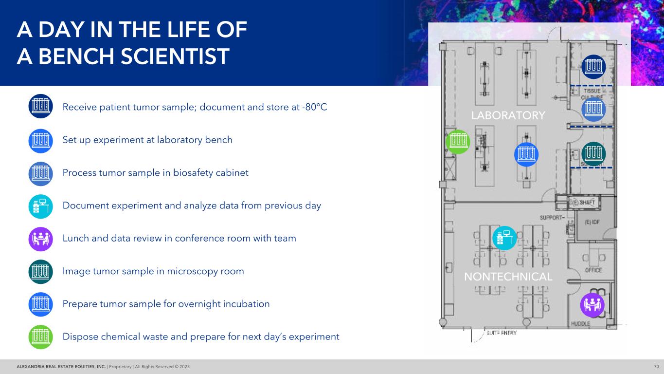 70ALEXANDRIA REAL ESTATE EQUITIES, INC. | Proprietary | All Rights Reserved © 2023 Image tumor sample in microscopy room A DAY IN THE LIFE OF A BENCH SCIENTIST Document experiment and analyze data from previous day Lunch and data review in conference room with team LABORATORY NONTECHNICAL Dispose chemical waste and prepare for next day’s experiment Process tumor sample in biosafety cabinet Set up experiment at laboratory bench Receive patient tumor sample; document and store at -80°C Prepare tumor sample for overnight incubation