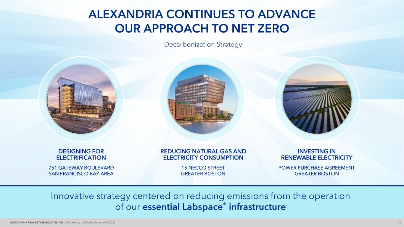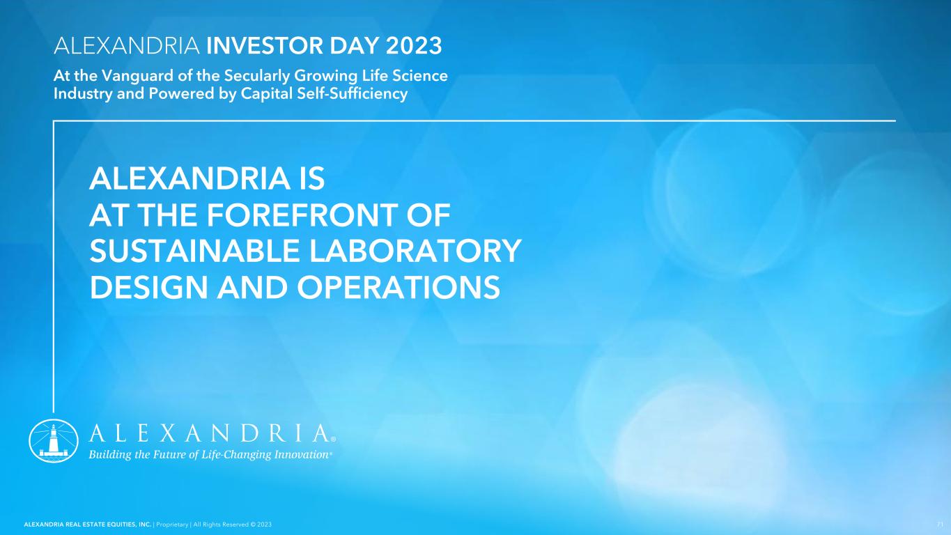 71ALEXANDRIA REAL ESTATE EQUITIES, INC. | Proprietary | All Rights Reserved © 2023 ALEXANDRIA INVESTOR DAY 2023 At the Vanguard of the Secularly Growing Life Science Industry and Powered by Capital Self-Sufficiency ALEXANDRIA IS AT THE FOREFRONT OF SUSTAINABLE LABORATORY DESIGN AND OPERATIONS