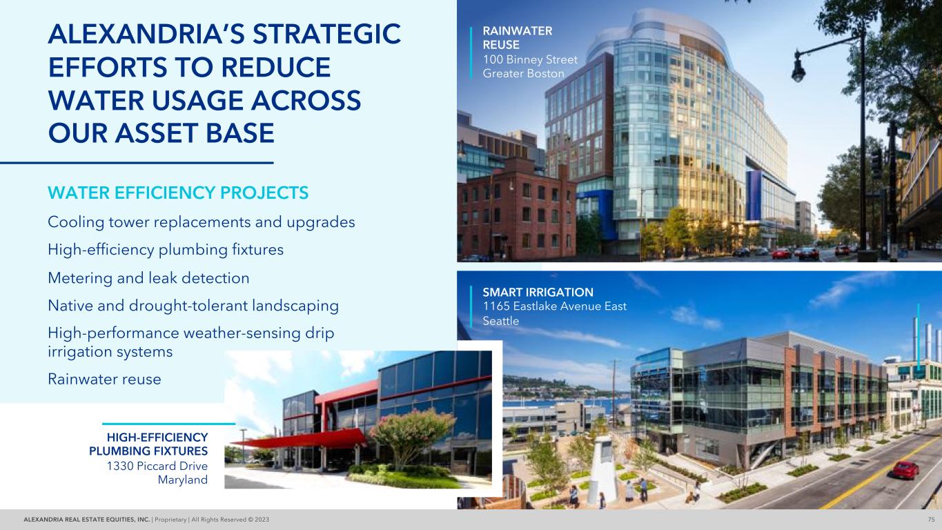 75ALEXANDRIA REAL ESTATE EQUITIES, INC. | Proprietary | All Rights Reserved © 2023 WATER EFFICIENCY PROJECTS Cooling tower replacements and upgrades High-efficiency plumbing fixtures Metering and leak detection Native and drought-tolerant landscaping High-performance weather-sensing drip irrigation systems Rainwater reuse ALEXANDRIA’S STRATEGIC EFFORTS TO REDUCE WATER USAGE ACROSS OUR ASSET BASE HIGH-EFFICIENCY PLUMBING FIXTURES 1330 Piccard Drive Maryland SMART IRRIGATION 1165 Eastlake Avenue East Seattle RAINWATER REUSE 100 Binney Street Greater Boston